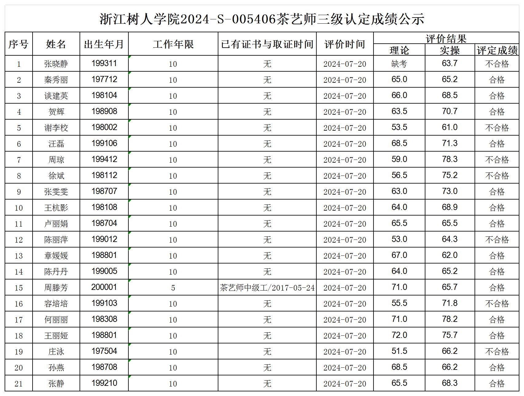 根据《浙江省人力资源和社会保障厅办公室关于印发<浙江省社会评价组织职业技能等级认定操作指南(试行)>的通知》,经审核,现将2024-S-005406批次茶艺师三级职业技能等级认定成绩予以公示,公示期2024年7月24日至7月30日,如对公示情况有异议,请提供有效证据,并实名电话或书面联系公司职业技能认定中心。
