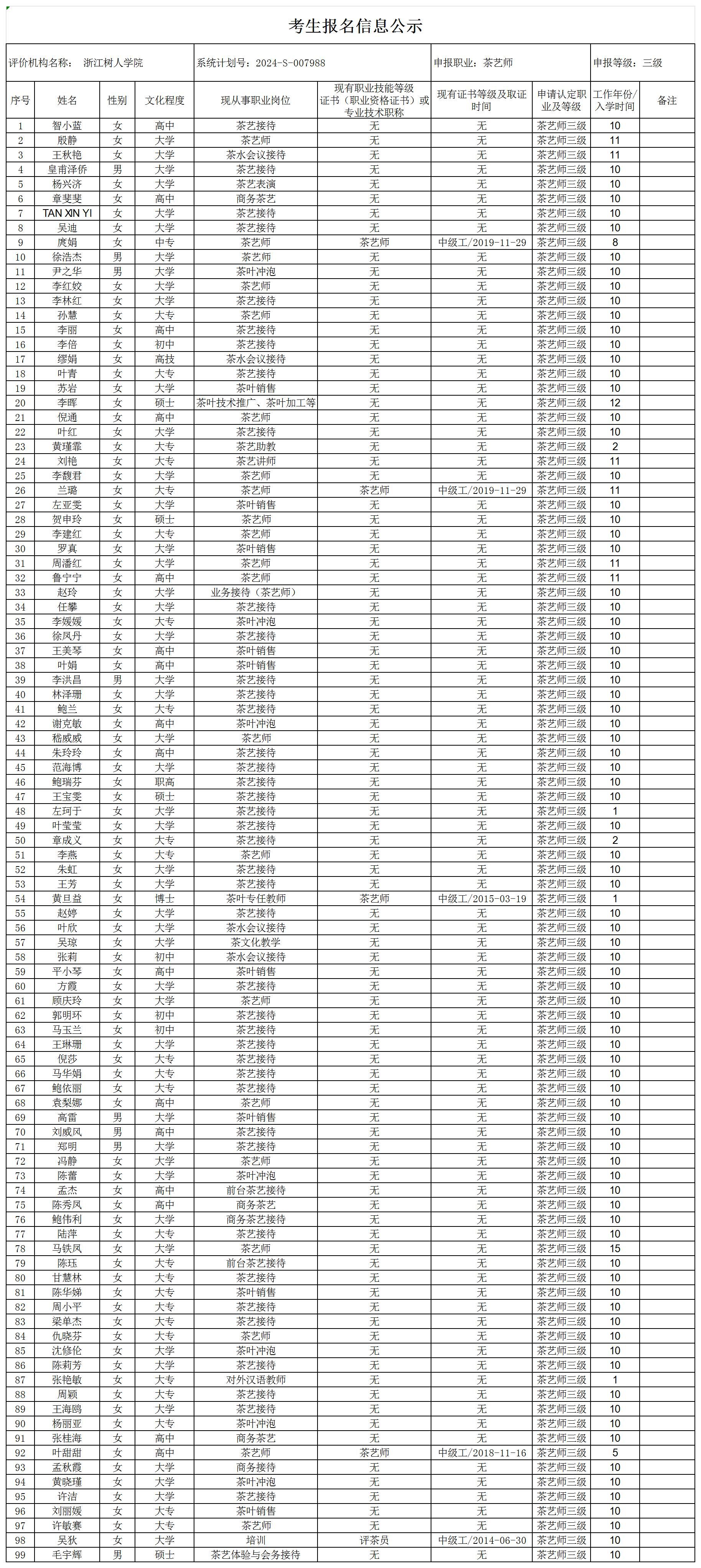 现将通过2024-S-007988批次茶艺师高级工(三级)职业技能等级认定资格审核考生信息予以公示,公示期2024年8月12日至8月16日,如对公示情况有异议,请提供有效证据,并实名电话或书面联系公司职业技能认定中心。