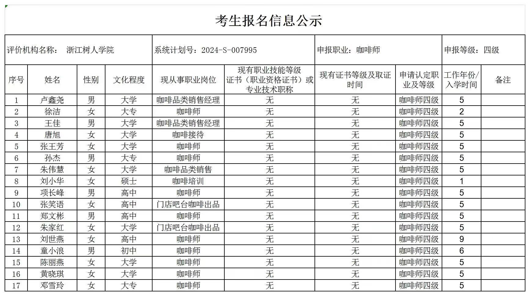 现将通过2024-S-007995批次咖啡师中级工(四级)职业技能等级认定资格审核考生信息予以公示,公示期2024年8月12日至8月16日,如对公示情况有异议,请提供有效证据,并实名电话或书面联系公司职业技能认定中心。