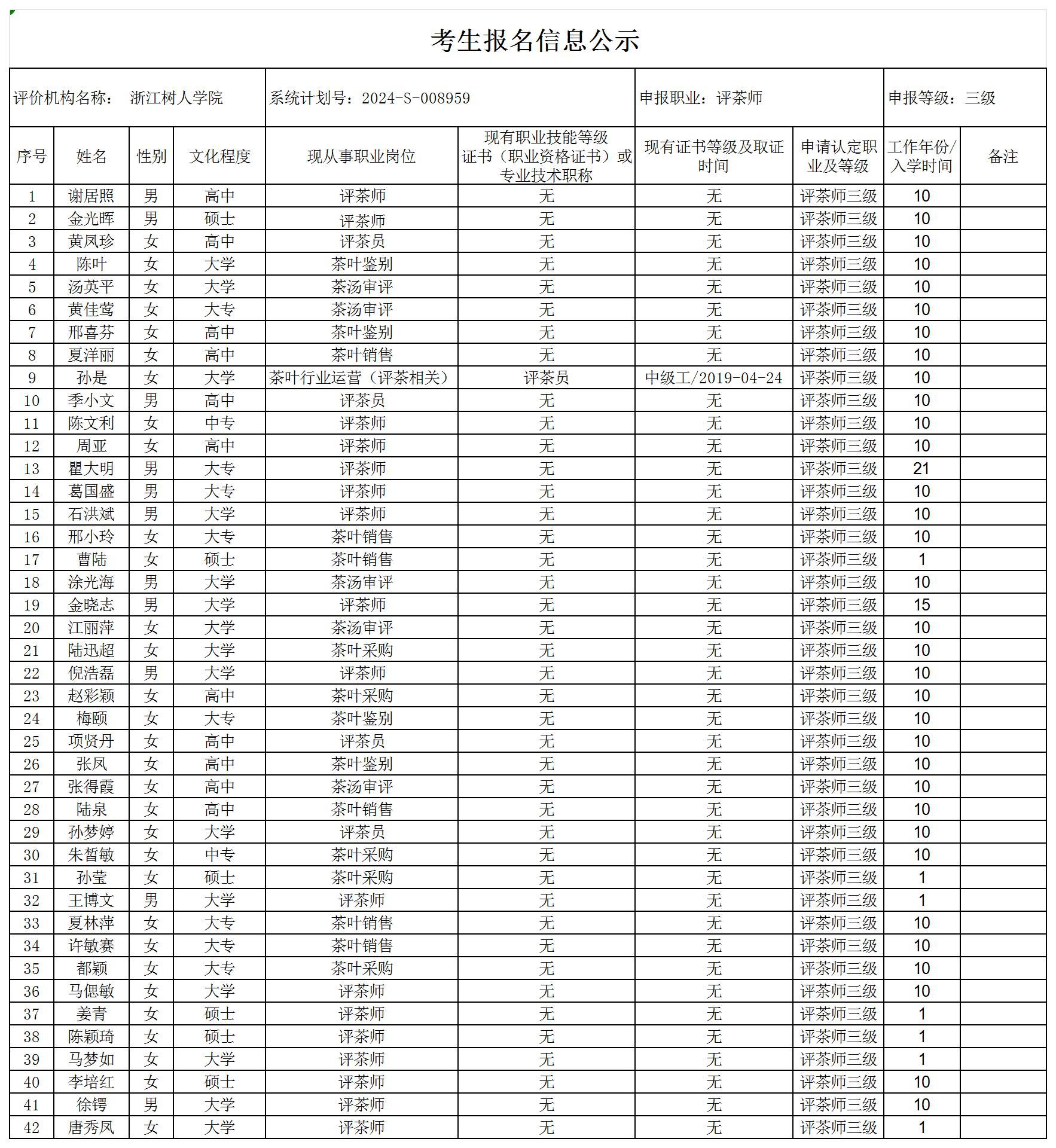 现将通过2024-S-008959批次评茶师高级工(三级)职业技能等级认定资格审核考生信息予以公示,公示期2024年9月9日至9月13日,如对公示情况有异议,请提供有效证据,并实名电话或书面联系公司职业技能认定中心。