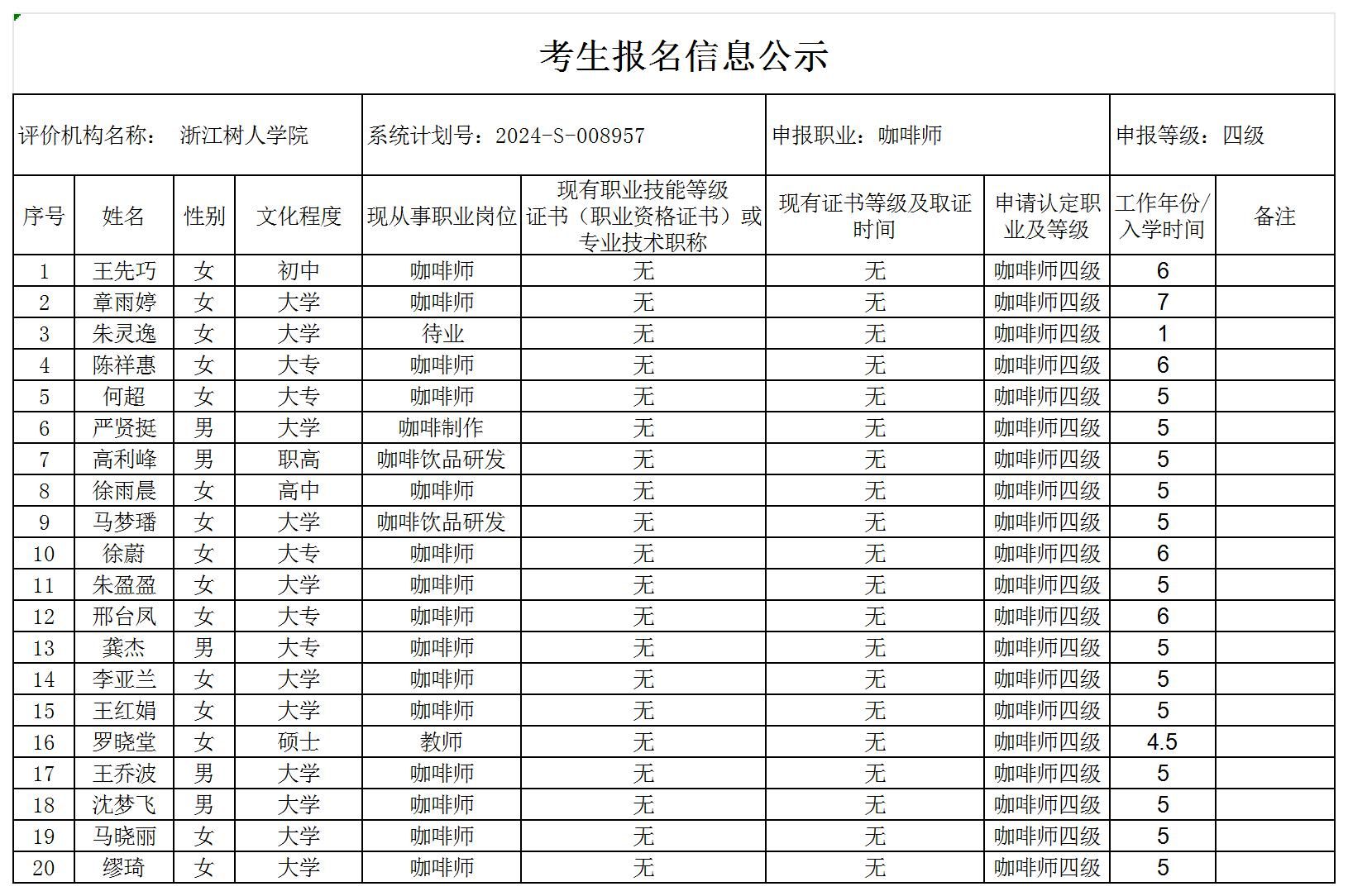 现将通过2024-S-008957批次咖啡师中级工(四级)职业技能等级认定资格审核考生信息予以公示,公示期2024年9月9日至9月13日,如对公示情况有异议,请提供有效证据,并实名电话或书面联系公司职业技能认定中心。