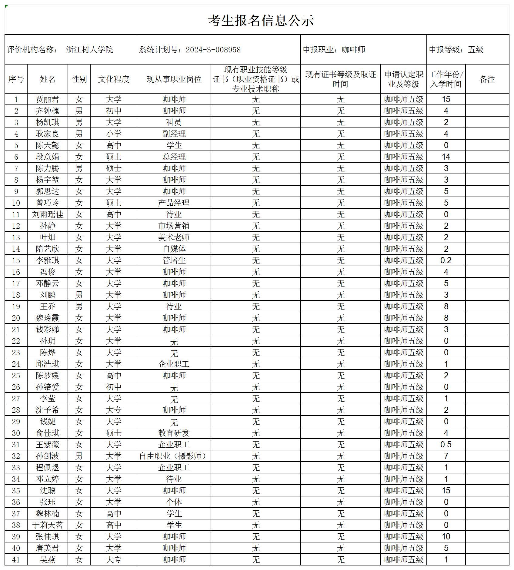 现将通过2024-S-008958批次咖啡师初级工(五级)职业技能等级认定资格审核考生信息予以公示,公示期2024年9月9日至9月13日,如对公示情况有异议,请提供有效证据,并实名电话或书面联系公司职业技能认定中心。