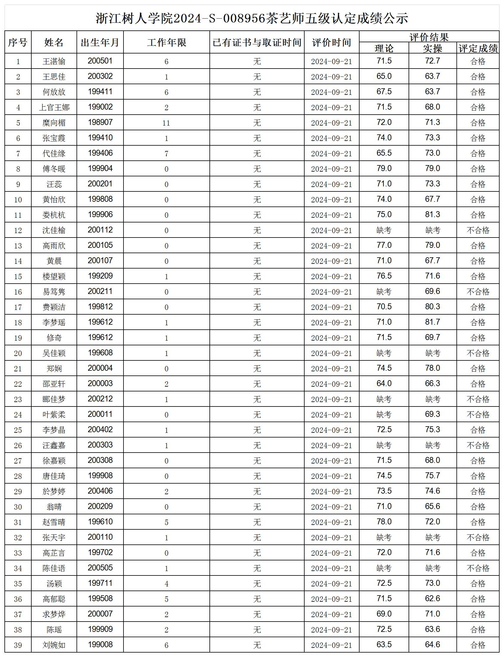 根据《浙江省人力资源和社会保障厅办公室关于印发<浙江省社会评价组织职业技能等级认定操作指南(试行)>的通知》,经审核,现将2024-S-008956批次茶艺师五级职业技能等级认定成绩予以公示,公示期2024年9月26日至10月8日,如对公示情况有异议,请提供有效证据,并实名电话或书面联系公司职业技能认定中心。