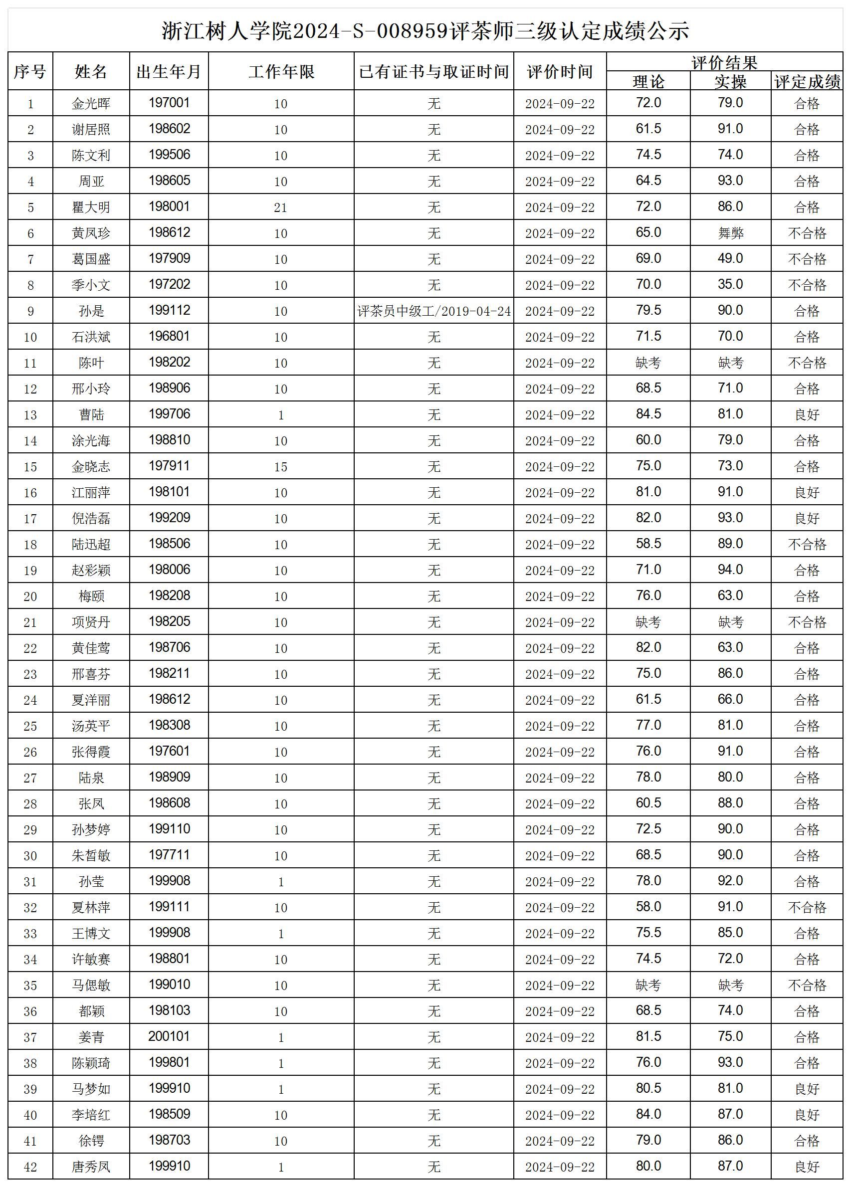 根据《浙江省人力资源和社会保障厅办公室关于印发<浙江省社会评价组织职业技能等级认定操作指南(试行)>的通知》,经审核,现将2024-S-008959批次评茶师三级职业技能等级认定成绩予以公示,公示期2024年9月26日至10月8日,如对公示情况有异议,请提供有效证据,并实名电话或书面联系公司职业技能认定中心。