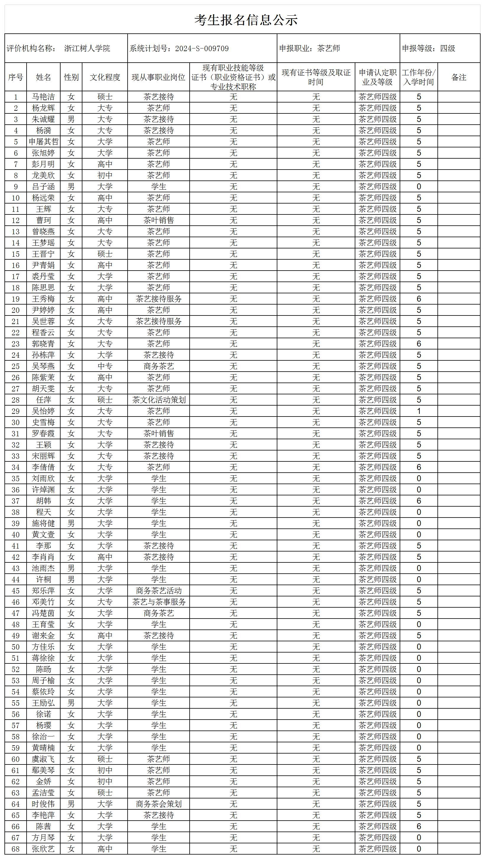 现将通过2024-S-009709批次茶艺师中级工(四级)职业技能等级认定资格审核考生信息予以公示,公示期2024年10月14日至10月18日,如对公示情况有异议,请提供有效证据,并实名电话或书面联系公司职业技能认定中心。