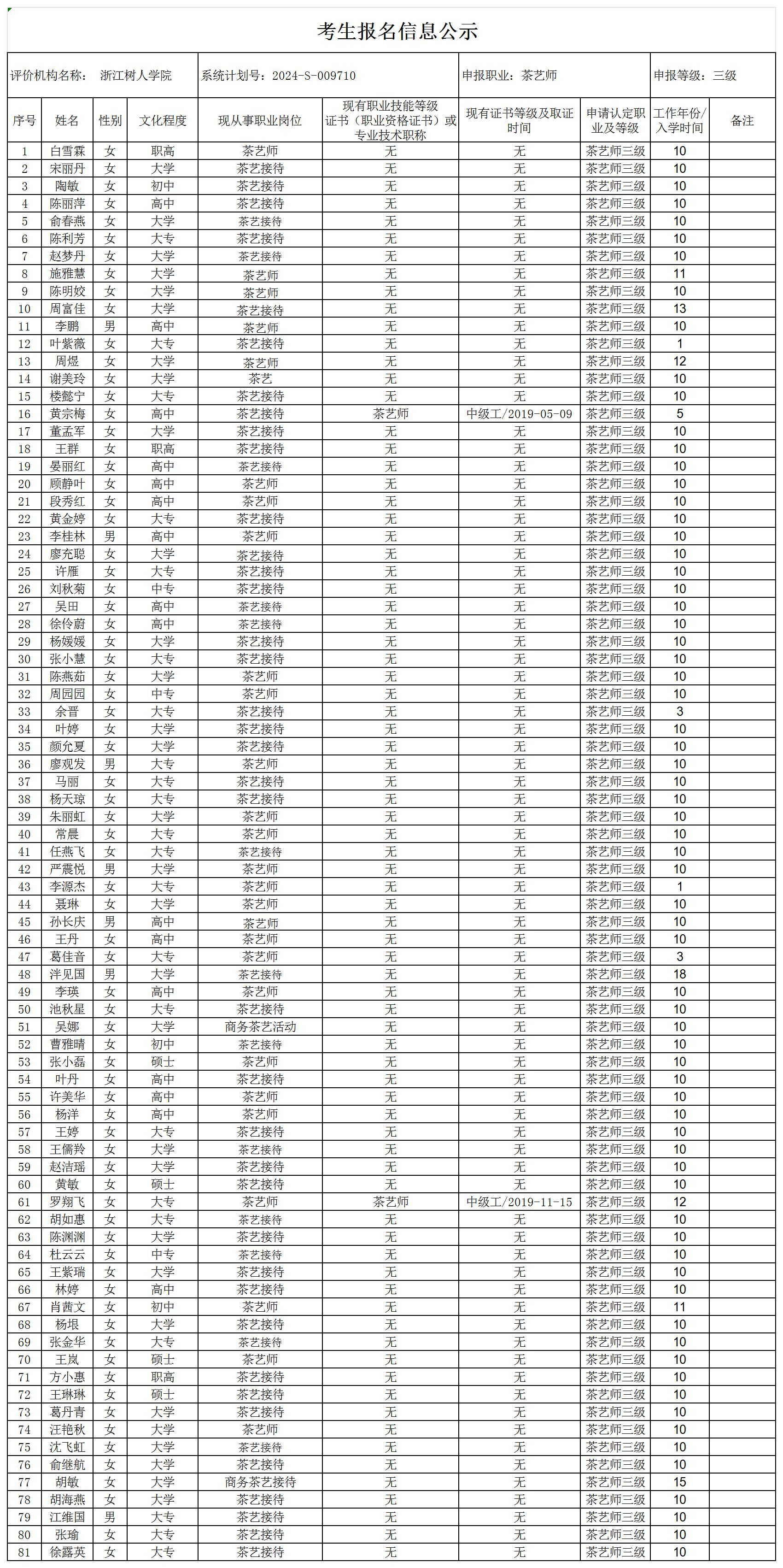 现将通过2024-S-009710批次茶艺师高级工(三级)职业技能等级认定资格审核考生信息予以公示,公示期2024年10月14日至10月18日,如对公示情况有异议,请提供有效证据,并实名电话或书面联系公司职业技能认定中心。