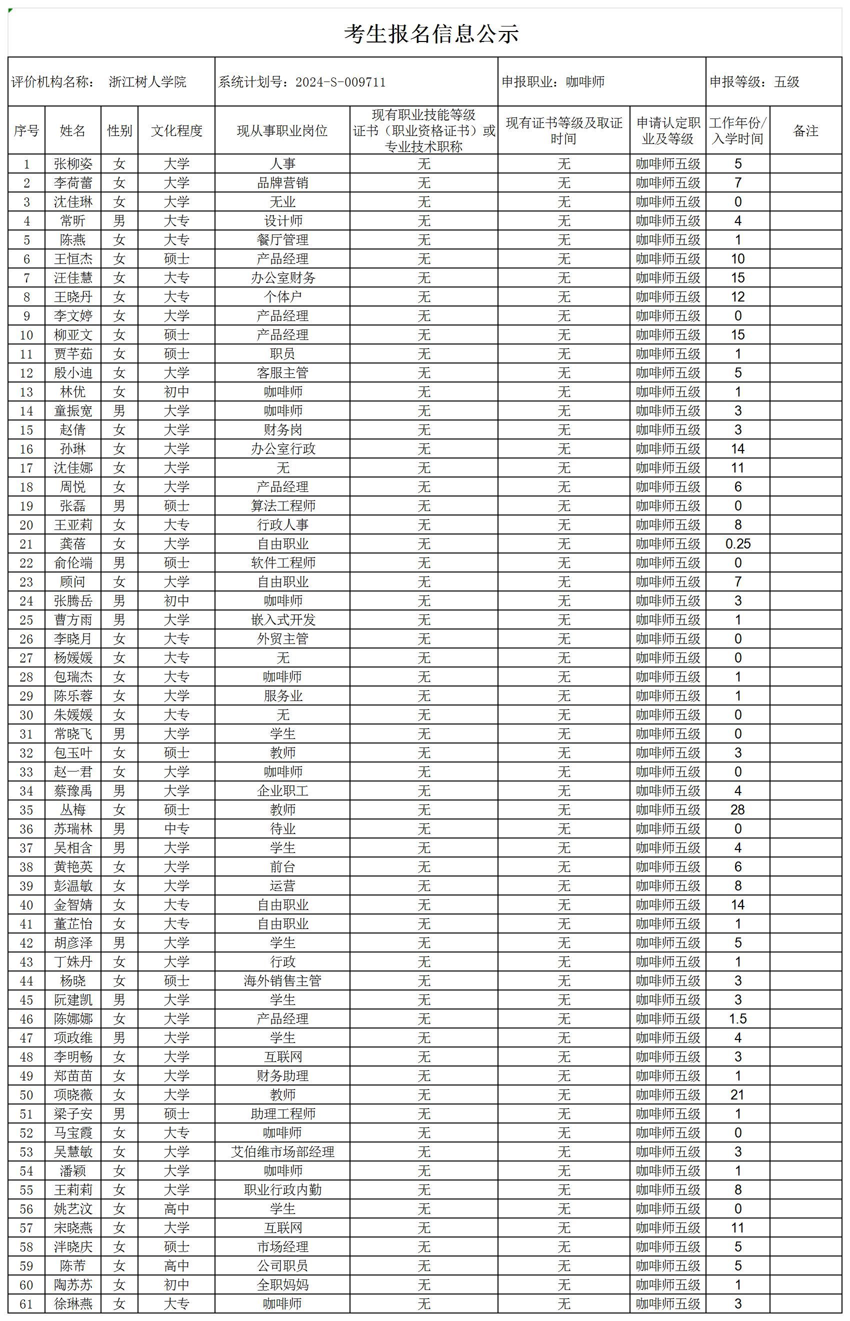 现将通过2024-S-009711批次咖啡师初级工(五级)职业技能等级认定资格审核考生信息予以公示,公示期2024年10月14日至10月18日,如对公示情况有异议,请提供有效证据,并实名电话或书面联系公司职业技能认定中心。