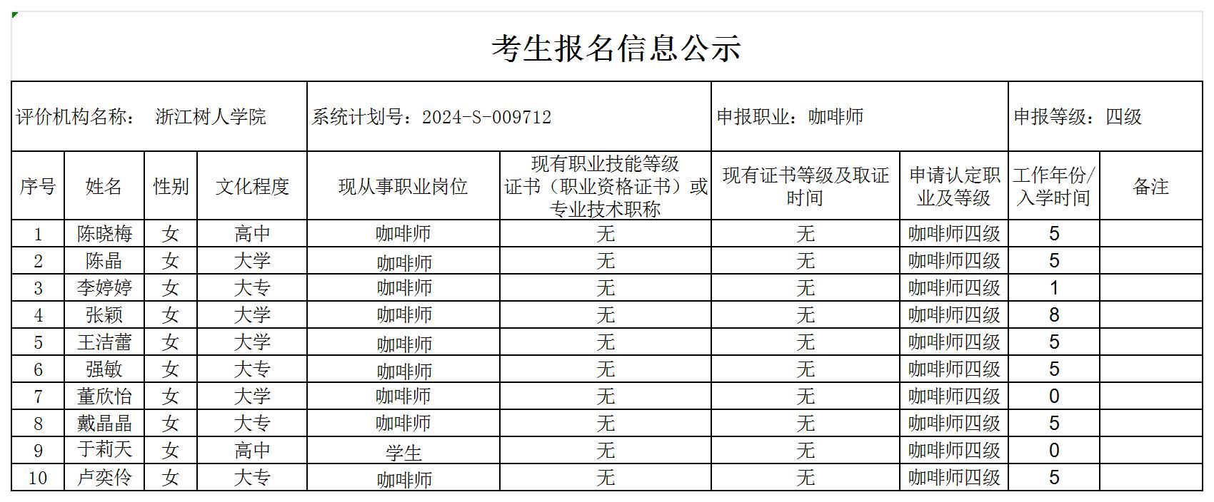 现将通过2024-S-009712批次咖啡师中级工(四级)职业技能等级认定资格审核考生信息予以公示,公示期2024年10月14日至10月18日,如对公示情况有异议,请提供有效证据,并实名电话或书面联系公司职业技能认定中心。
