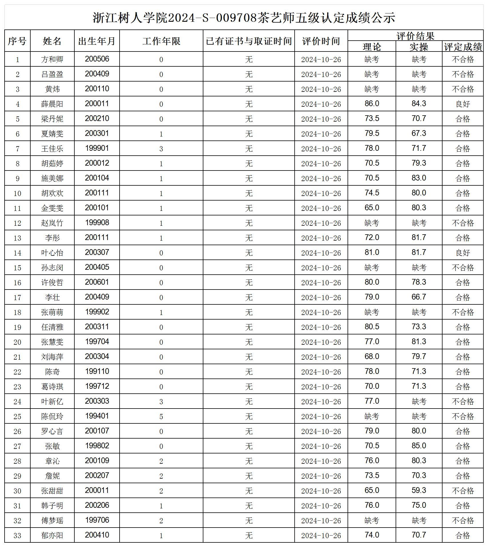 根据《浙江省人力资源和社会保障厅办公室关于印发<浙江省社会评价组织职业技能等级认定操作指南(试行)>的通知》,经审核,现将2024-S-009708批次茶艺师五级职业技能等级认定成绩予以公示,公示期2024年10月30日至11月5日,如对公示情况有异议,请提供有效证据,并实名电话或书面联系公司职业技能认定中心。