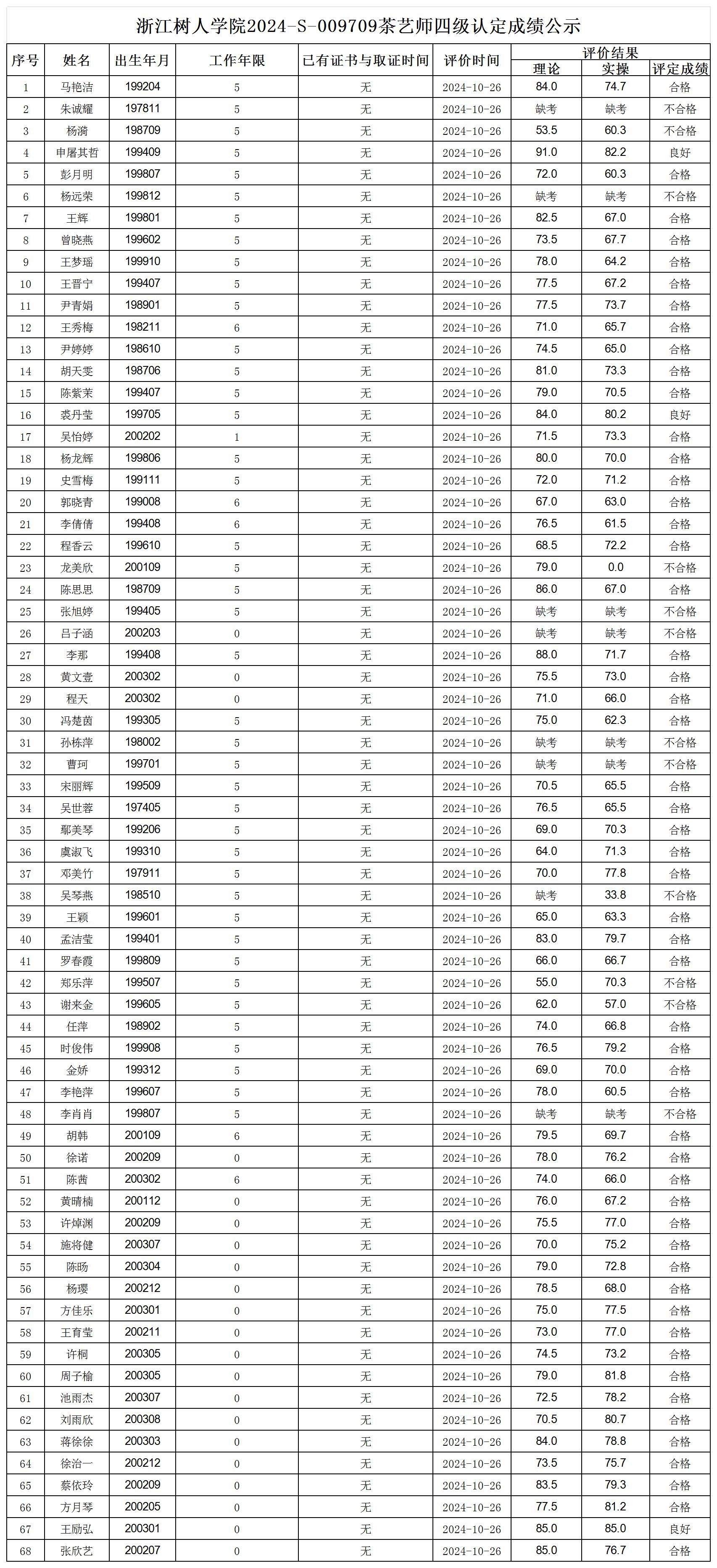 根据《浙江省人力资源和社会保障厅办公室关于印发<浙江省社会评价组织职业技能等级认定操作指南(试行)>的通知》,经审核,现将2024-S-009709批次茶艺师四级职业技能等级认定成绩予以公示,公示期2024年10月30日至11月5日,如对公示情况有异议,请提供有效证据,并实名电话或书面联系公司职业技能认定中心。