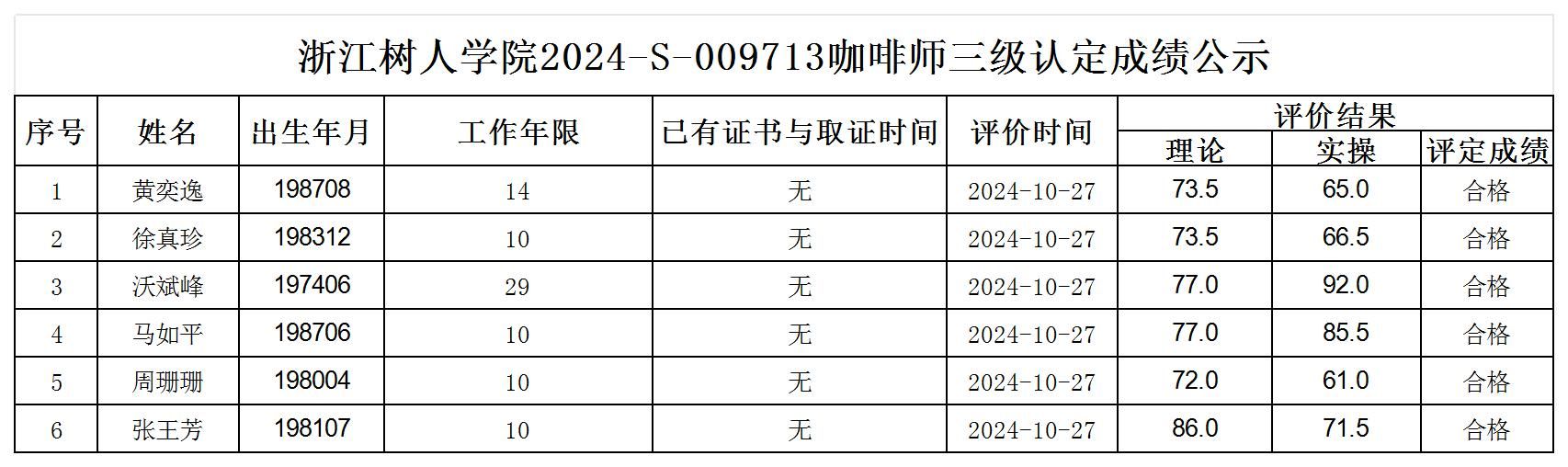 根据《浙江省人力资源和社会保障厅办公室关于印发<浙江省社会评价组织职业技能等级认定操作指南(试行)>的通知》,经审核,现将2024-S-009713批次咖啡师三级职业技能等级认定成绩予以公示,公示期2024年10月30日至11月5日,如对公示情况有异议,请提供有效证据,并实名电话或书面联系公司职业技能认定中心。