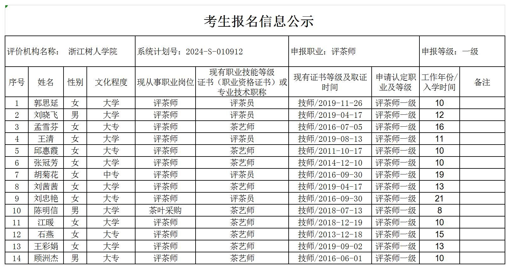 现将通过2024-S-010912批次评茶师高级技师(一级)职业技能等级认定资格审核考生信息予以公示,公示期2024年11月11日至11月15日,如对公示情况有异议,请提供有效证据,并实名电话或书面联系公司职业技能认定中心。