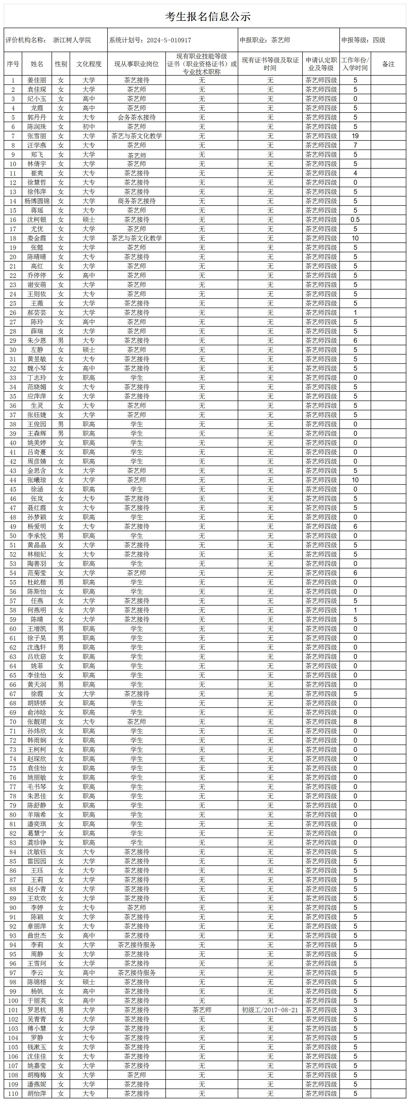 现将通过2024-S-010917批次茶艺师中级工(四级)职业技能等级认定资格审核考生信息予以公示,公示期2024年11月11日至11月15日,如对公示情况有异议,请提供有效证据,并实名电话或书面联系公司职业技能认定中心。