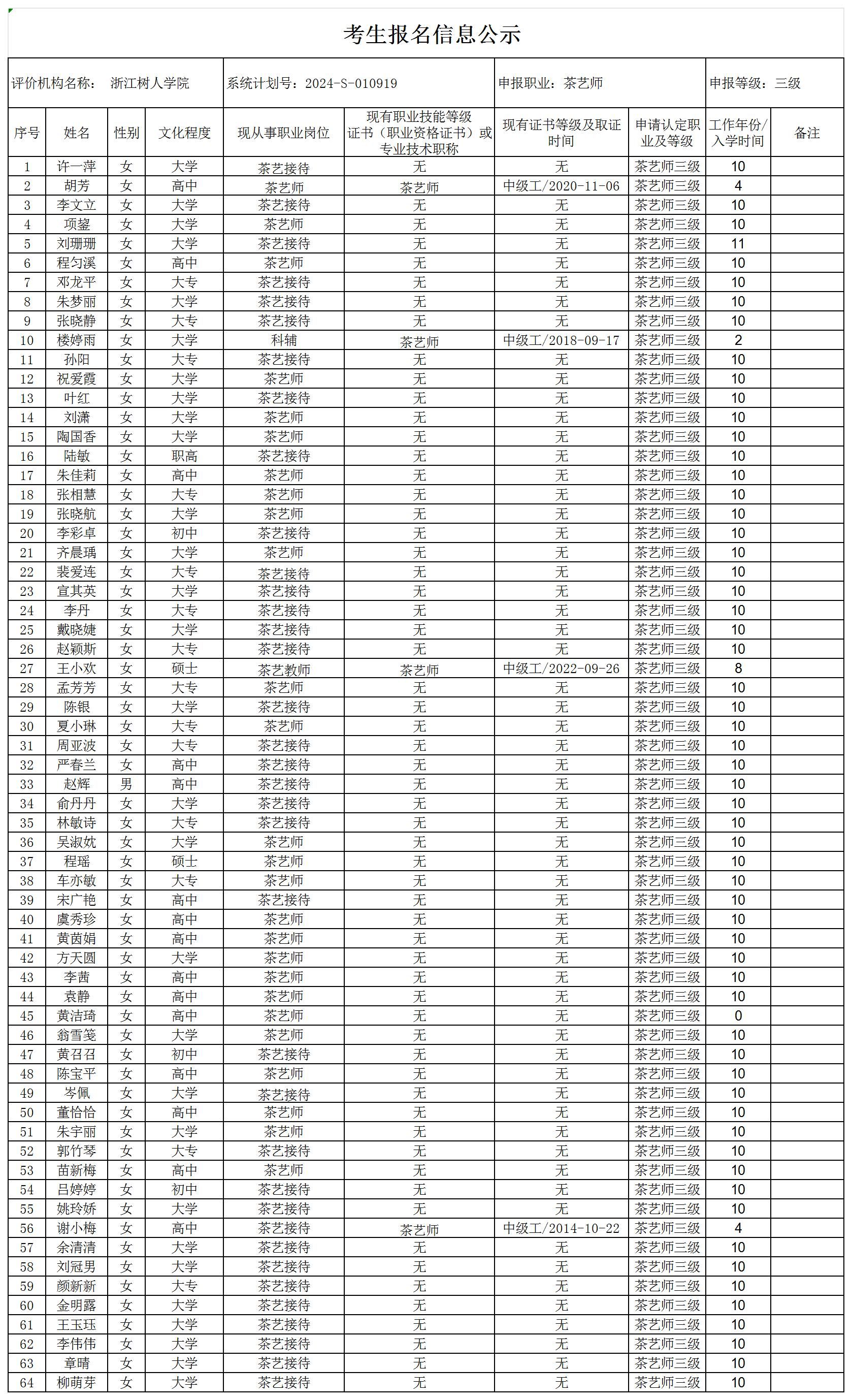 现将通过2024-S-010919批次茶艺师高级工(三级)职业技能等级认定资格审核考生信息予以公示,公示期2024年11月11日至11月15日,如对公示情况有异议,请提供有效证据,并实名电话或书面联系公司职业技能认定中心。