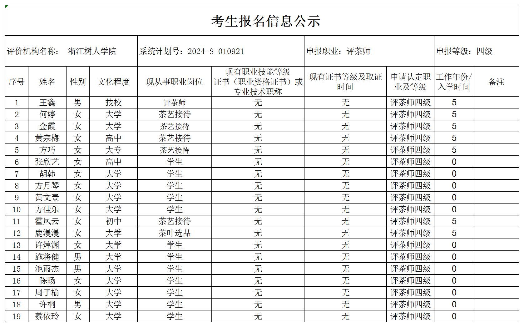 现将通过2024-S-010921批次评茶师中级工(四级)职业技能等级认定资格审核考生信息予以公示,公示期2024年11月11日至11月15日,如对公示情况有异议,请提供有效证据,并实名电话或书面联系公司职业技能认定中心。