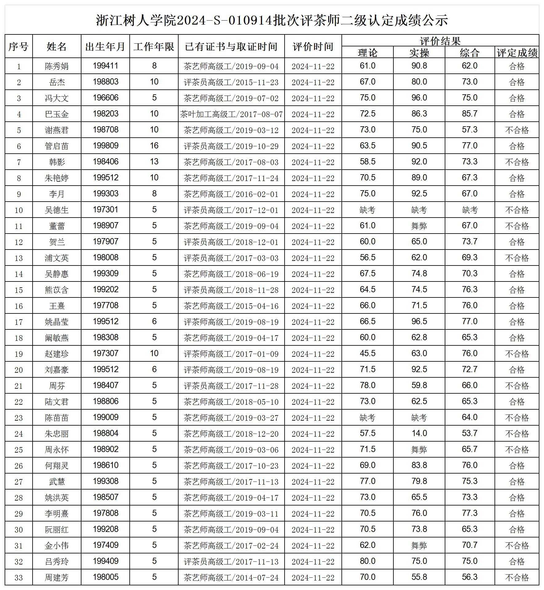 根据《浙江省人力资源和社会保障厅办公室关于印发<浙江省社会评价组织职业技能等级认定操作指南(试行)>的通知》,经审核,现将2024-S-010914批次评茶师二级职业技能等级认定成绩予以公示,公示期2024年11月27日至12月3日,如对公示情况有异议,请提供有效证据,并实名电话或书面联系公司职业技能认定中心。