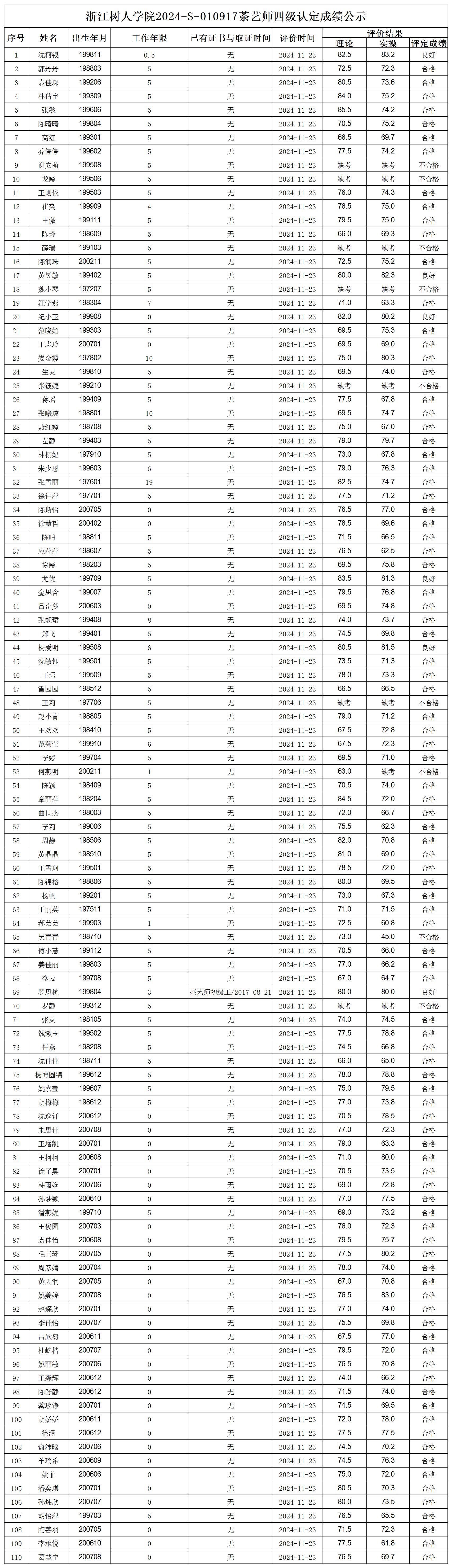根据《浙江省人力资源和社会保障厅办公室关于印发<浙江省社会评价组织职业技能等级认定操作指南(试行)>的通知》,经审核,现将2024-S-010917批次茶艺师四级职业技能等级认定成绩予以公示,公示期2024年11月27日至12月3日,如对公示情况有异议,请提供有效证据,并实名电话或书面联系公司职业技能认定中心。