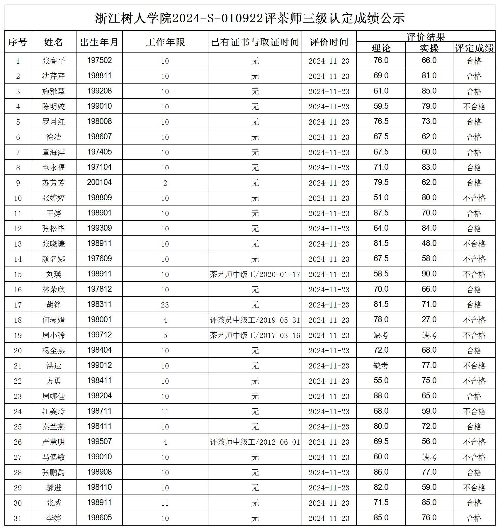 根据《浙江省人力资源和社会保障厅办公室关于印发<浙江省社会评价组织职业技能等级认定操作指南(试行)>的通知》,经审核,现将2024-S-010922批次评茶师三级职业技能等级认定成绩予以公示,公示期2024年11月27日至12月3日,如对公示情况有异议,请提供有效证据,并实名电话或书面联系公司职业技能认定中心。