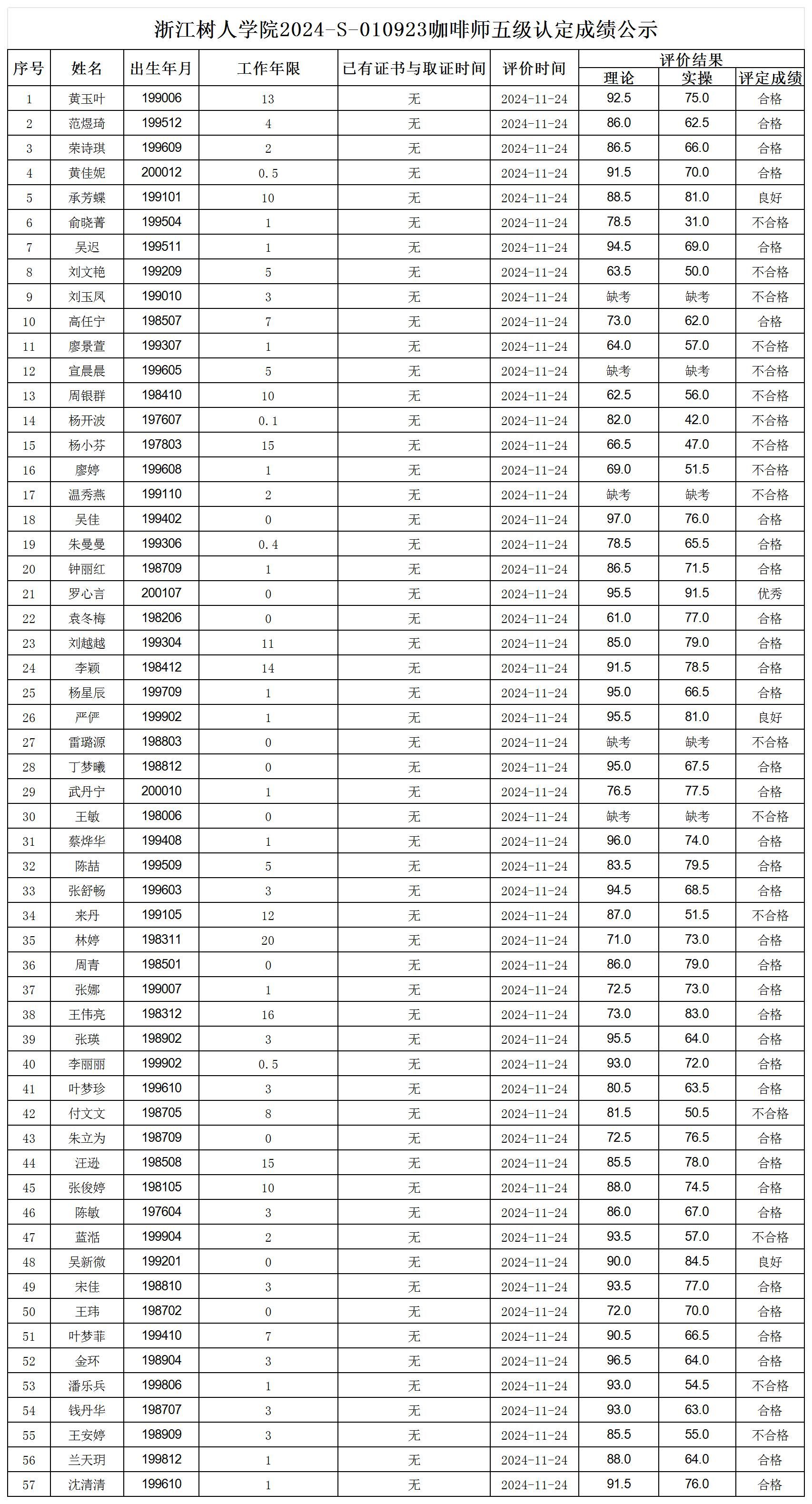 根据《浙江省人力资源和社会保障厅办公室关于印发<浙江省社会评价组织职业技能等级认定操作指南(试行)>的通知》,经审核,现将2024-S-010923批次咖啡师五级职业技能等级认定成绩予以公示,公示期2024年11月27日至12月3日,如对公示情况有异议,请提供有效证据,并实名电话或书面联系公司职业技能认定中心。
