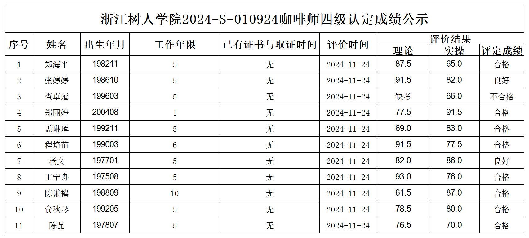 根据《浙江省人力资源和社会保障厅办公室关于印发<浙江省社会评价组织职业技能等级认定操作指南(试行)>的通知》,经审核,现将2024-S-010924批次咖啡师四级职业技能等级认定成绩予以公示,公示期2024年11月27日至12月3日,如对公示情况有异议,请提供有效证据,并实名电话或书面联系公司职业技能认定中心。