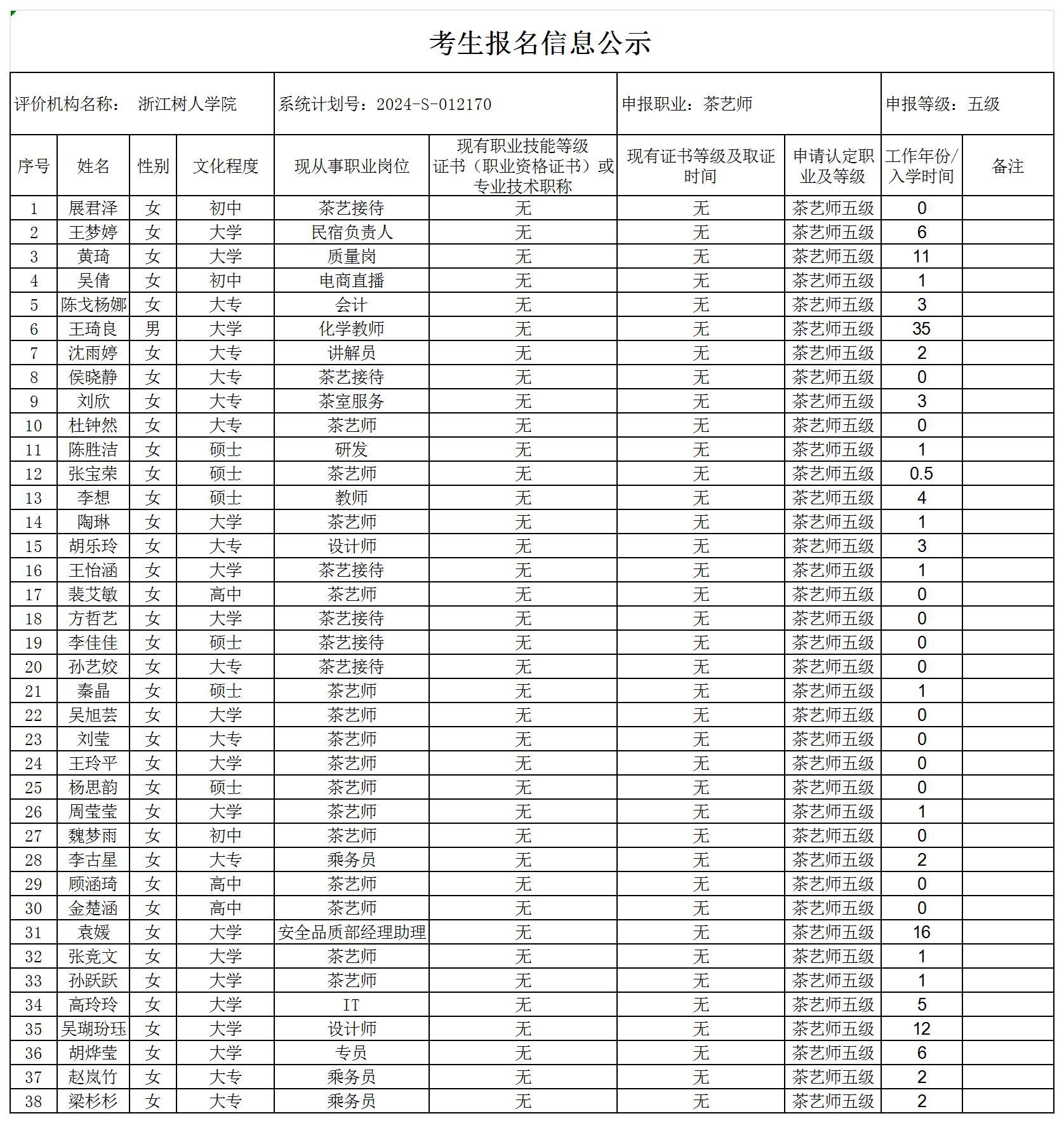 现将通过2024-S-012170批次茶艺师初级工(五级)职业技能等级认定资格审核考生信息予以公示,公示期2024年12月9日至12月13日,如对公示情况有异议,请提供有效证据,并实名电话或书面联系公司职业技能认定中心。
