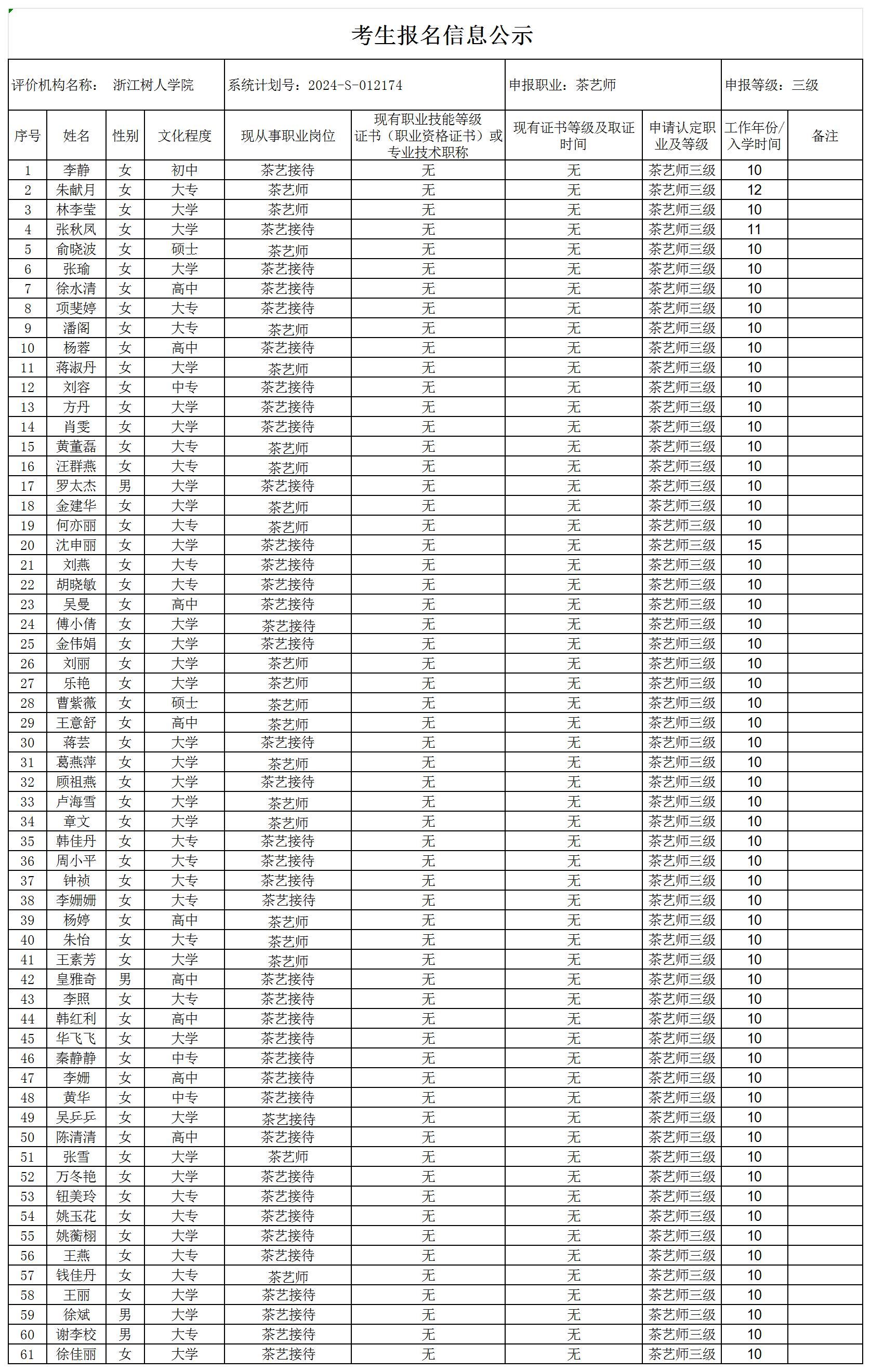 现将通过2024-S-012174批次茶艺师高级工(三级)职业技能等级认定资格审核考生信息予以公示,公示期2024年12月9日至12月13日,如对公示情况有异议,请提供有效证据,并实名电话或书面联系公司职业技能认定中心。
