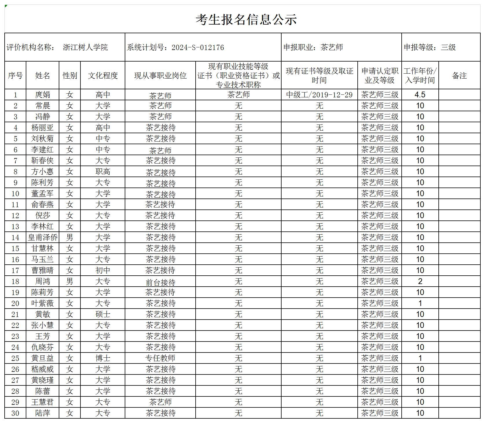 现将通过2024-S-012176批次茶艺师高级工(三级)职业技能等级认定资格审核考生信息予以公示,公示期2024年12月9日至12月13日,如对公示情况有异议,请提供有效证据,并实名电话或书面联系公司职业技能认定中心。