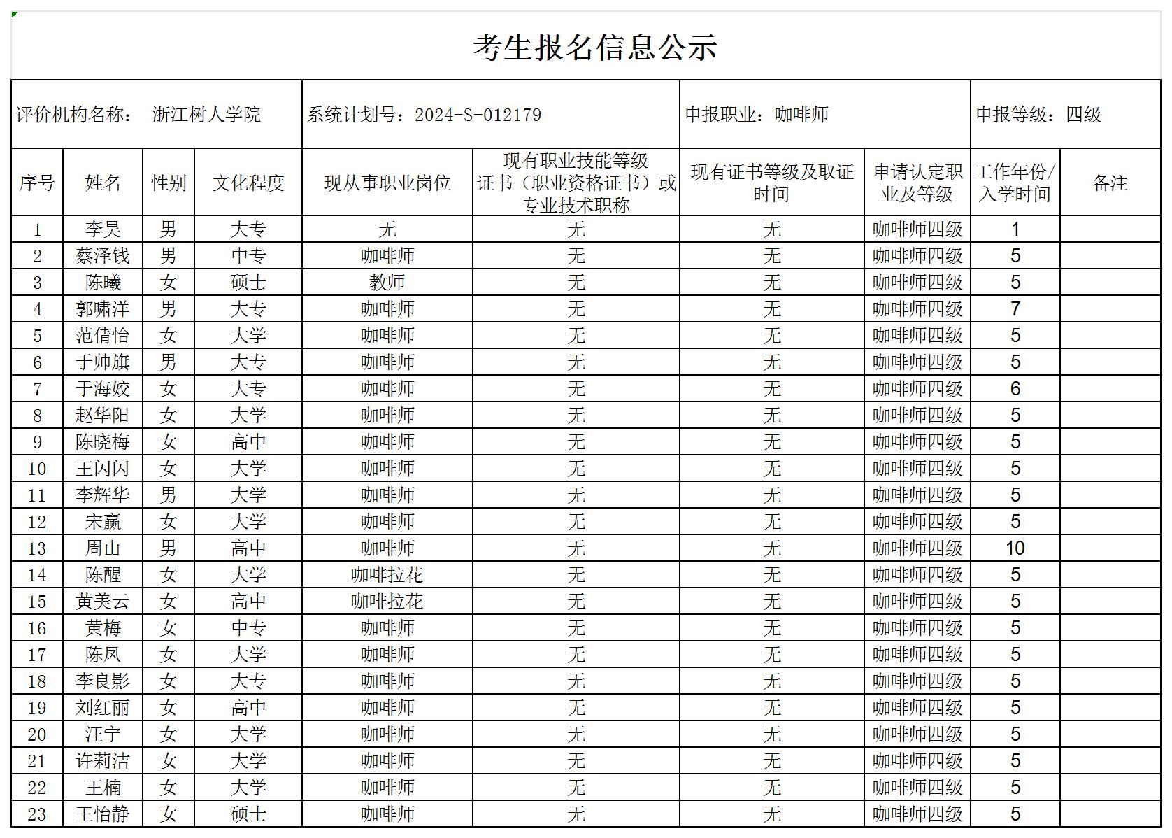 现将通过2024-S-012179批次咖啡师中级工(四级)职业技能等级认定资格审核考生信息予以公示,公示期2024年12月9日至12月13日,如对公示情况有异议,请提供有效证据,并实名电话或书面联系公司职业技能认定中心。