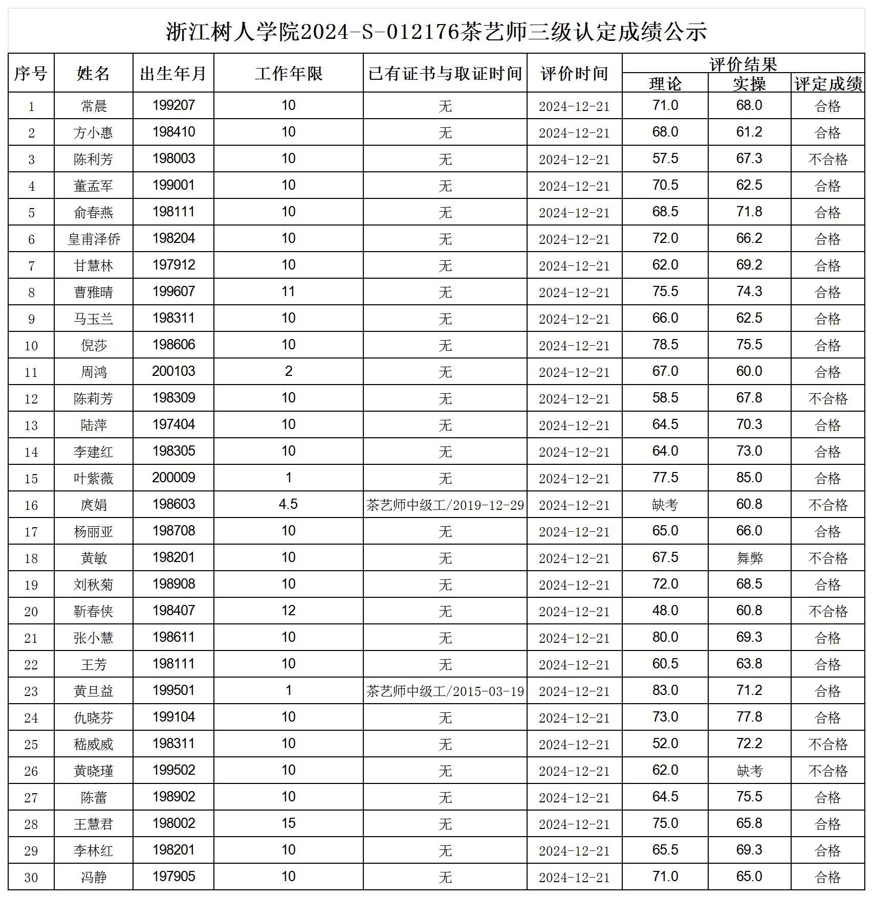 根据《浙江省人力资源和社会保障厅办公室关于印发<浙江省社会评价组织职业技能等级认定操作指南(试行)>的通知》,经审核,现将2024-S-012176批次茶艺师三级职业技能等级认定成绩予以公示,公示期2024年12月25日至12月31日,如对公示情况有异议,请提供有效证据,并实名电话或书面联系公司职业技能认定中心。