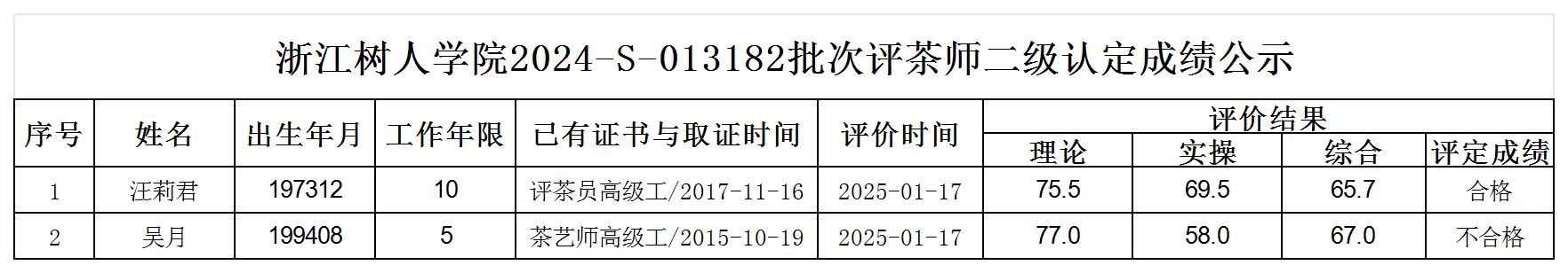 根据《浙江省人力资源和社会保障厅办公室关于印发<浙江省社会评价组织职业技能等级认定操作指南(试行)>的通知》,经审核,现将2024-S-013182批次评茶师二级职业技能等级认定成绩予以公示,公示期2025年1月22日至1月28日,如对公示情况有异议,请提供有效证据,并实名电话或书面联系公司职业技能认定中心。