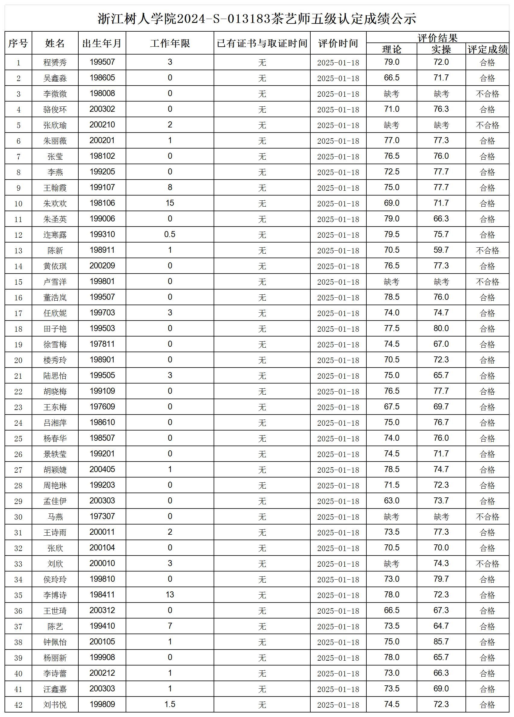 根据《浙江省人力资源和社会保障厅办公室关于印发<浙江省社会评价组织职业技能等级认定操作指南(试行)>的通知》,经审核,现将2024-S-013183批次茶艺师五级职业技能等级认定成绩予以公示,公示期2025年1月22日至1月28日,如对公示情况有异议,请提供有效证据,并实名电话或书面联系公司职业技能认定中心。
