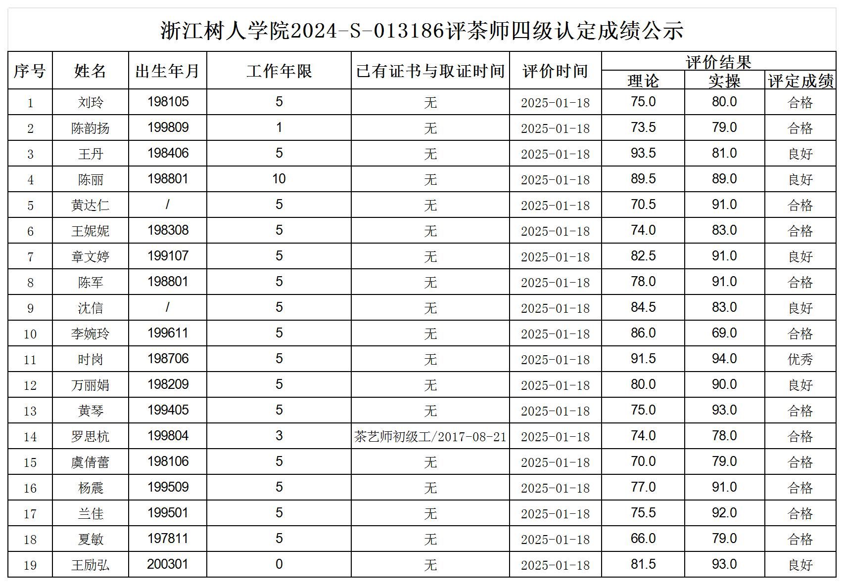 根据《浙江省人力资源和社会保障厅办公室关于印发<浙江省社会评价组织职业技能等级认定操作指南(试行)>的通知》,经审核,现将2024-S-013186批次评茶师四级职业技能等级认定成绩予以公示,公示期2025年1月22日至1月28日,如对公示情况有异议,请提供有效证据,并实名电话或书面联系公司职业技能认定中心。