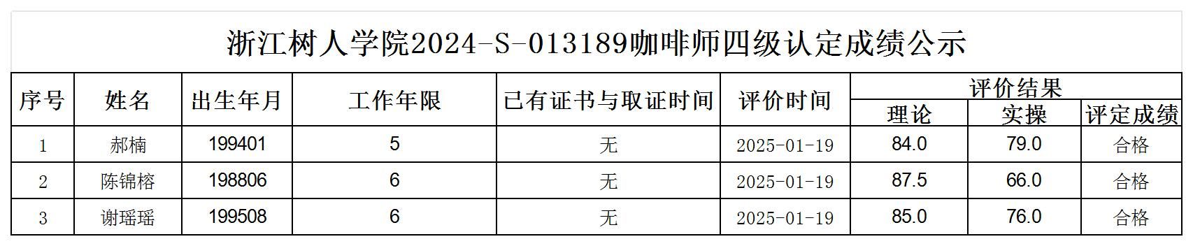 根据《浙江省人力资源和社会保障厅办公室关于印发<浙江省社会评价组织职业技能等级认定操作指南(试行)>的通知》,经审核,现将2024-S-013189批次咖啡师四级职业技能等级认定成绩予以公示,公示期2025年1月22日至1月28日,如对公示情况有异议,请提供有效证据,并实名电话或书面联系公司职业技能认定中心。