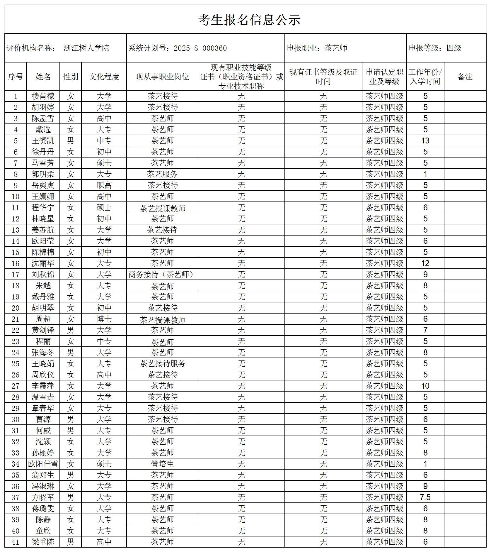 现将通过2025-S-000360批次茶艺师中级工(四级)职业技能等级认定资格审核考生信息予以公示,公示期2025年3月10日至3月14日,如对公示情况有异议,请提供有效证据,并实名电话或书面联系公司职业技能认定中心。