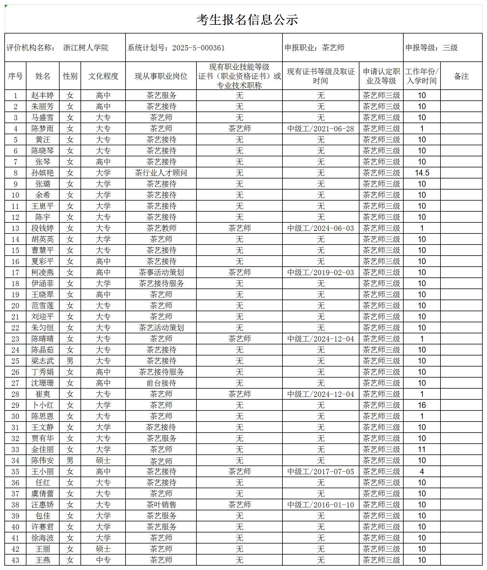 现将通过2025-S-000361批次茶艺师高级工(三级)职业技能等级认定资格审核考生信息予以公示,公示期2025年3月10日至3月14日,如对公示情况有异议,请提供有效证据,并实名电话或书面联系公司职业技能认定中心。