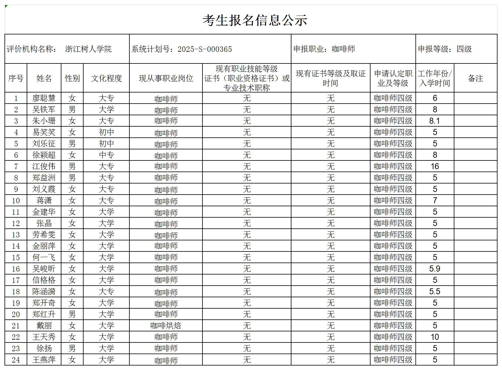 现将通过2025-S-000365批次咖啡师中级工(四级)职业技能等级认定资格审核考生信息予以公示,公示期2025年3月10日至3月14日,如对公示情况有异议,请提供有效证据,并实名电话或书面联系公司职业技能认定中心。