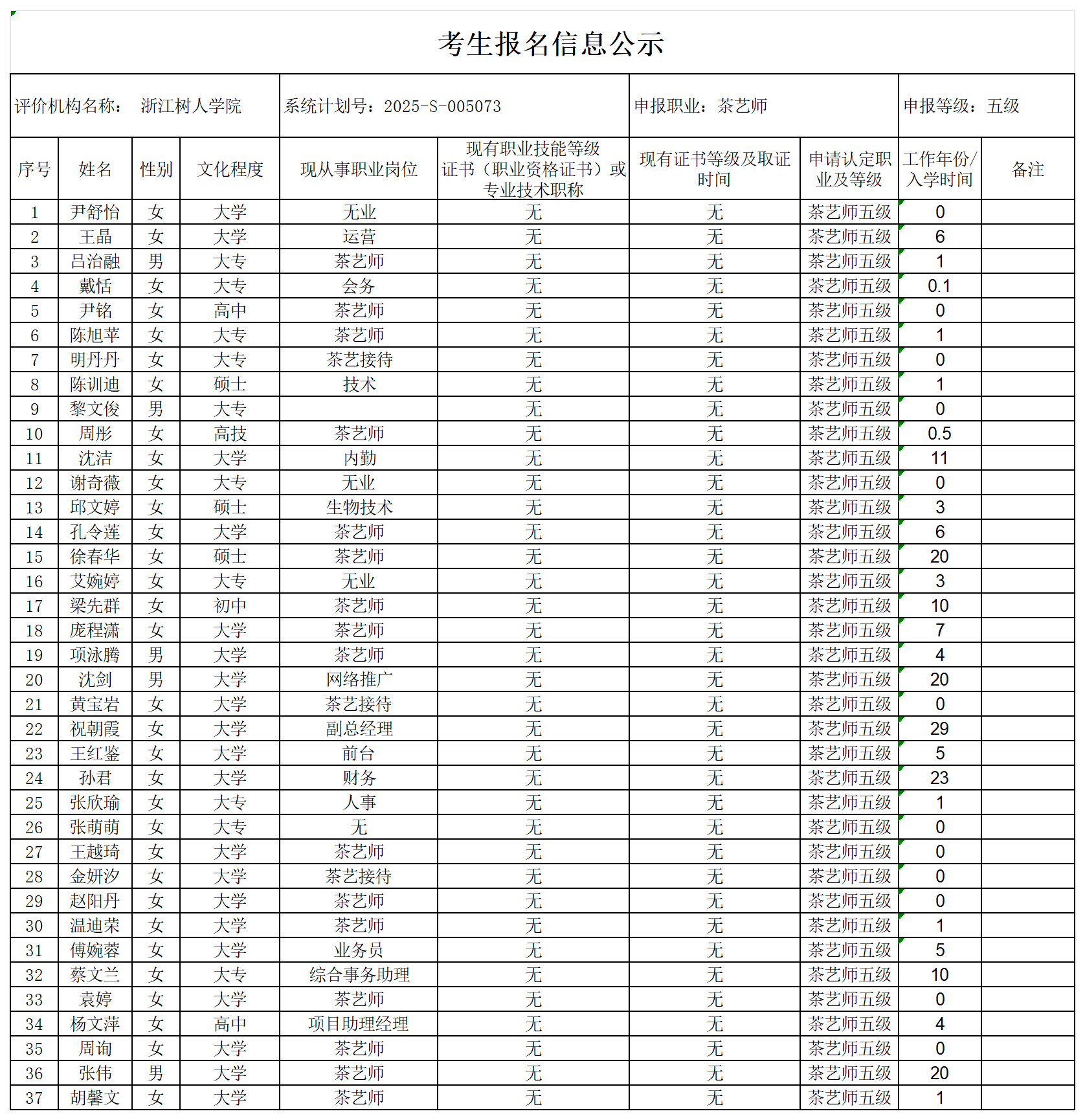 现将通过2025-S-005073批次初级茶艺师(五级)职业技能等级认定资格审核考生信息予以公示,公示期2025年7月8日至7月14日,如对公示情况有异议,请提供有效证据,并实名电话或书面联系公司职业技能等级认定中心。