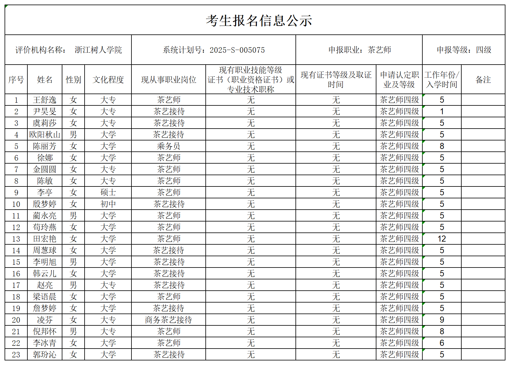现将通过2025-S-005075批次中级茶艺师(四级)职业技能等级认定资格审核考生信息予以公示,公示期2025年7月8日至7月14日,如对公示情况有异议,请提供有效证据,并实名电话或书面联系公司职业技能等级认定中心。