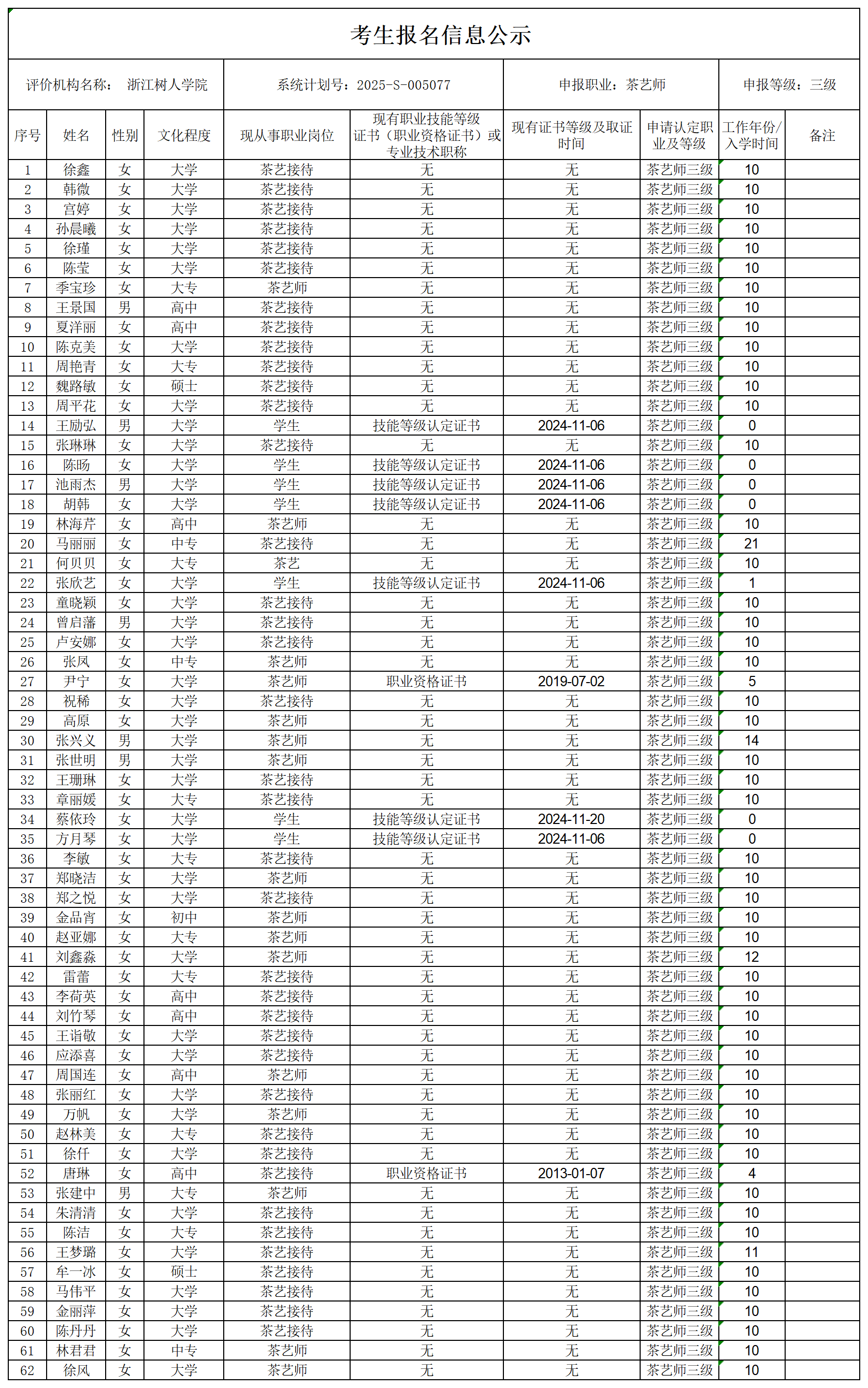 现将通过2025-S-005077批次高级茶艺师(三级)职业技能等级认定资格审核考生信息予以公示,公示期2025年7月8日至7月14日,如对公示情况有异议,请提供有效证据,并实名电话或书面联系公司职业技能等级认定中心。
