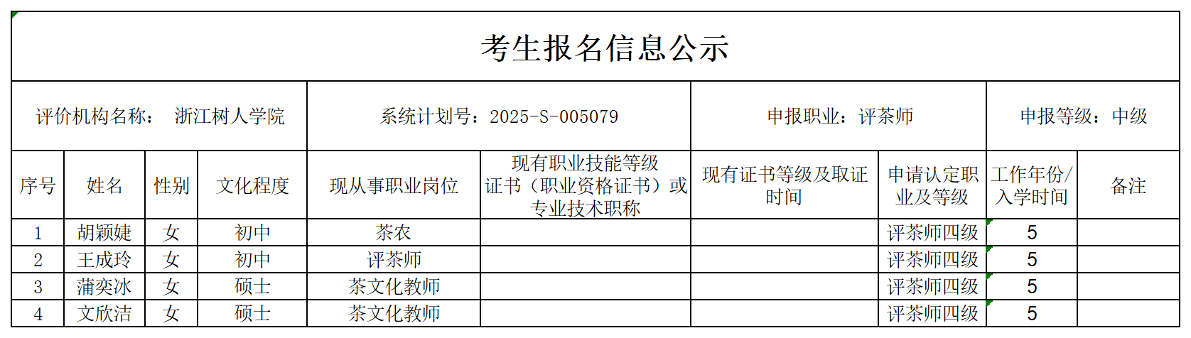 现将通过2025-S-005079批次中级评茶师(四级)职业技能等级认定资格审核考生信息予以公示,公示期2025年7月8日至7月14日,如对公示情况有异议,请提供有效证据,并实名电话或书面联系公司职业技能等级认定中心。