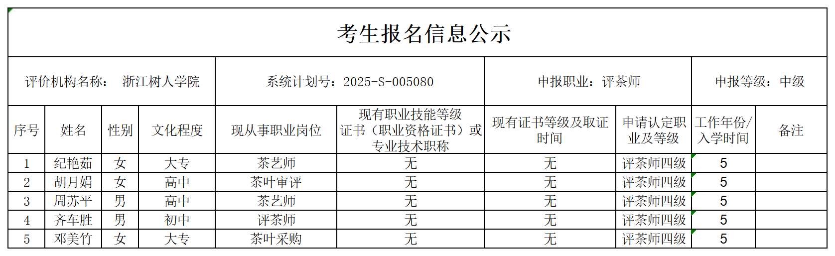现将通过2025-S-005080批次中级评茶师(四级)职业技能等级认定资格审核考生信息予以公示,公示期2025年7月8日至7月14日,如对公示情况有异议,请提供有效证据,并实名电话或书面联系公司职业技能等级认定中心。