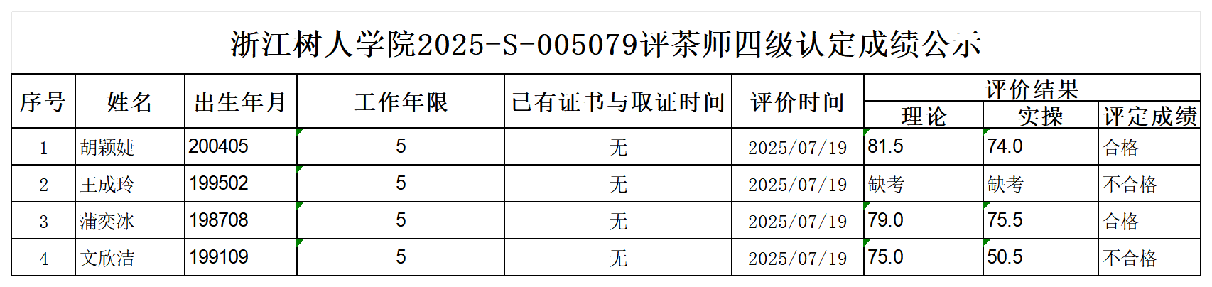根据《浙江省人力资源和社会保障厅办公室关于印发<浙江省社会评价组织职业技能等级认定操作指南(试行)>的通知》,经审核,现将2025-S-005079批次评茶师四级职业技能等级认定成绩予以公示,公示期2025年7月23日至7月29日,如对公示情况有异议,请提供有效证据,并实名电话或书面联系公司职业技能认定中心。