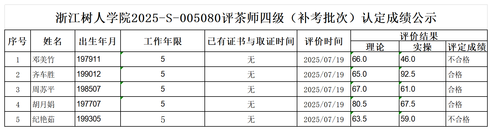 根据《浙江省人力资源和社会保障厅办公室关于印发<浙江省社会评价组织职业技能等级认定操作指南(试行)>的通知》,经审核,现将2025-S-005080批次评茶师四级职业技能等级认定成绩予以公示,公示期2025年7月23日至7月29日,如对公示情况有异议,请提供有效证据,并实名电话或书面联系公司职业技能认定中心。