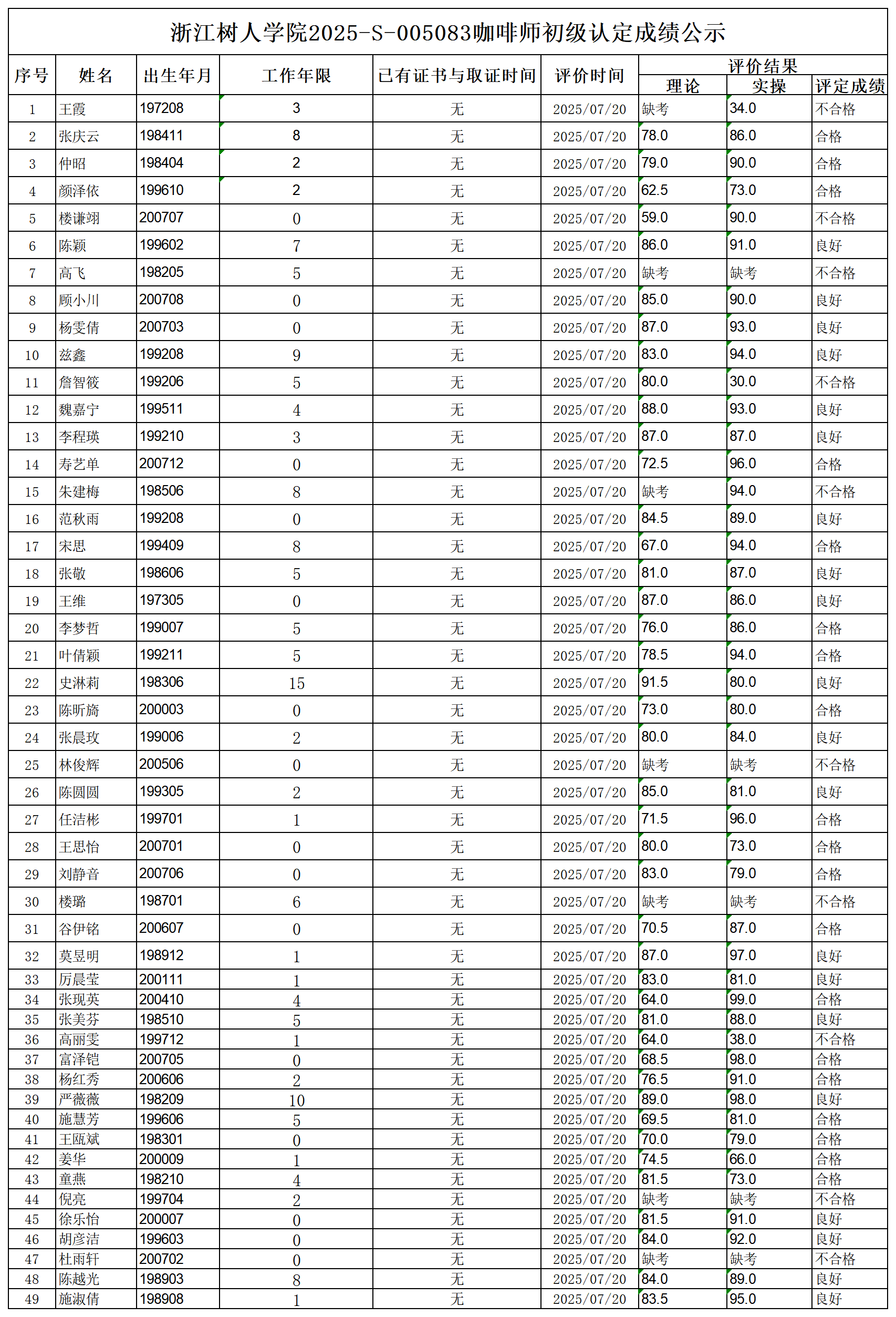 根据《浙江省人力资源和社会保障厅办公室关于印发<浙江省社会评价组织职业技能等级认定操作指南(试行)>的通知》,经审核,现将2025-S-005083批次咖啡师五级职业技能等级认定成绩予以公示,公示期2025年7月23日至7月29日,如对公示情况有异议,请提供有效证据,并实名电话或书面联系公司职业技能认定中心。