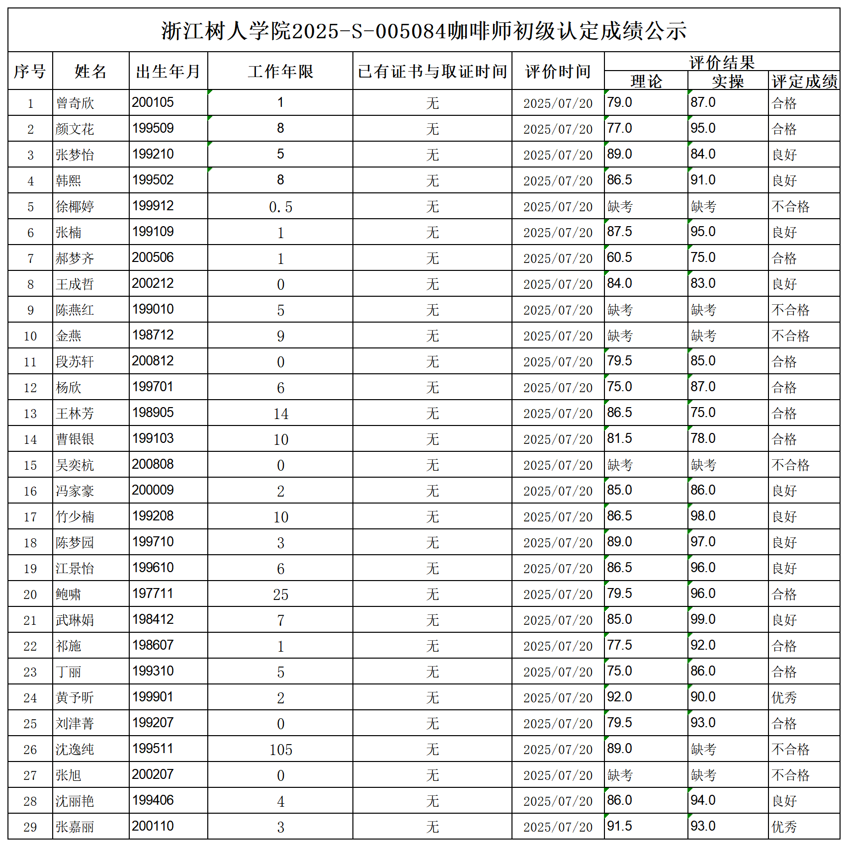 根据《浙江省人力资源和社会保障厅办公室关于印发<浙江省社会评价组织职业技能等级认定操作指南(试行)>的通知》,经审核,现将2025-S-005084批次咖啡师五级职业技能等级认定成绩予以公示,公示期2025年7月23日至7月29日,如对公示情况有异议,请提供有效证据,并实名电话或书面联系公司职业技能认定中心。