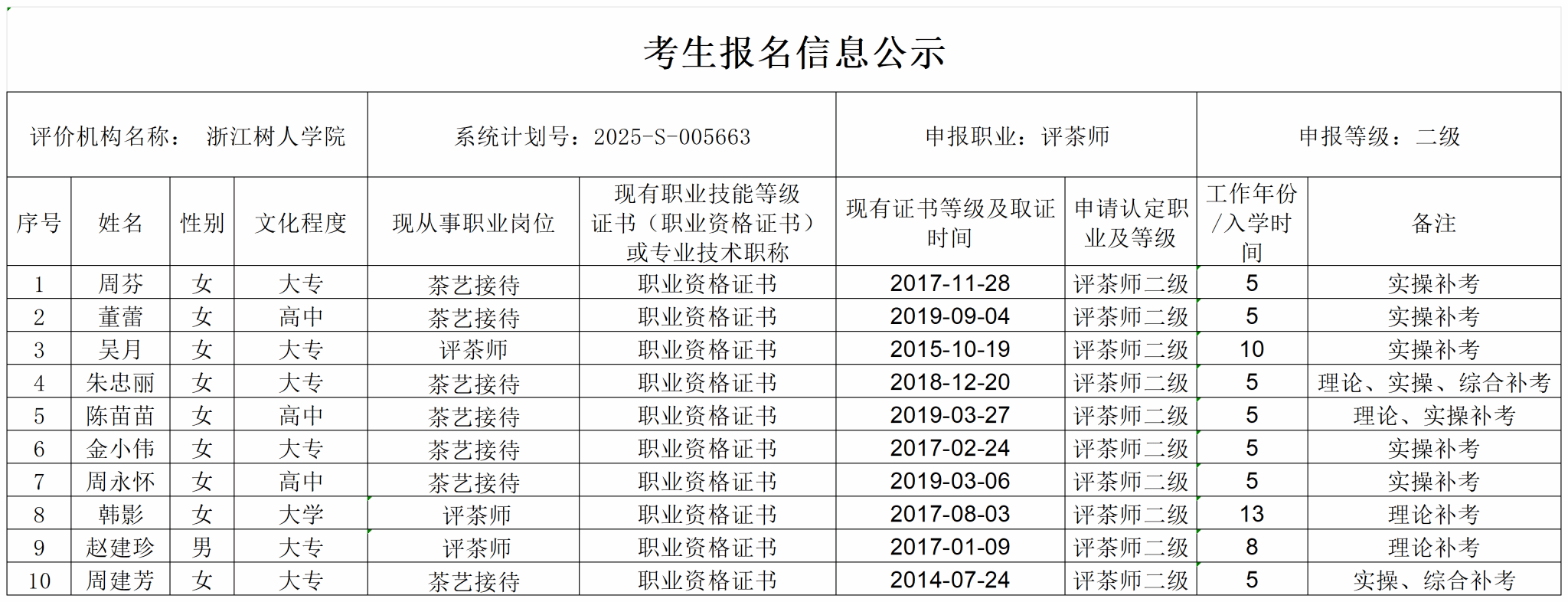 现将通过2025-S-005663 批次评茶师技师(二级)职业技能等级认定资格审核考生信息予以公示,公示期2025年8月1日至8月7日,如对公示情况有异议,请提供有效证据,并实名电话或书面联系公司职业技能等级认定中心。