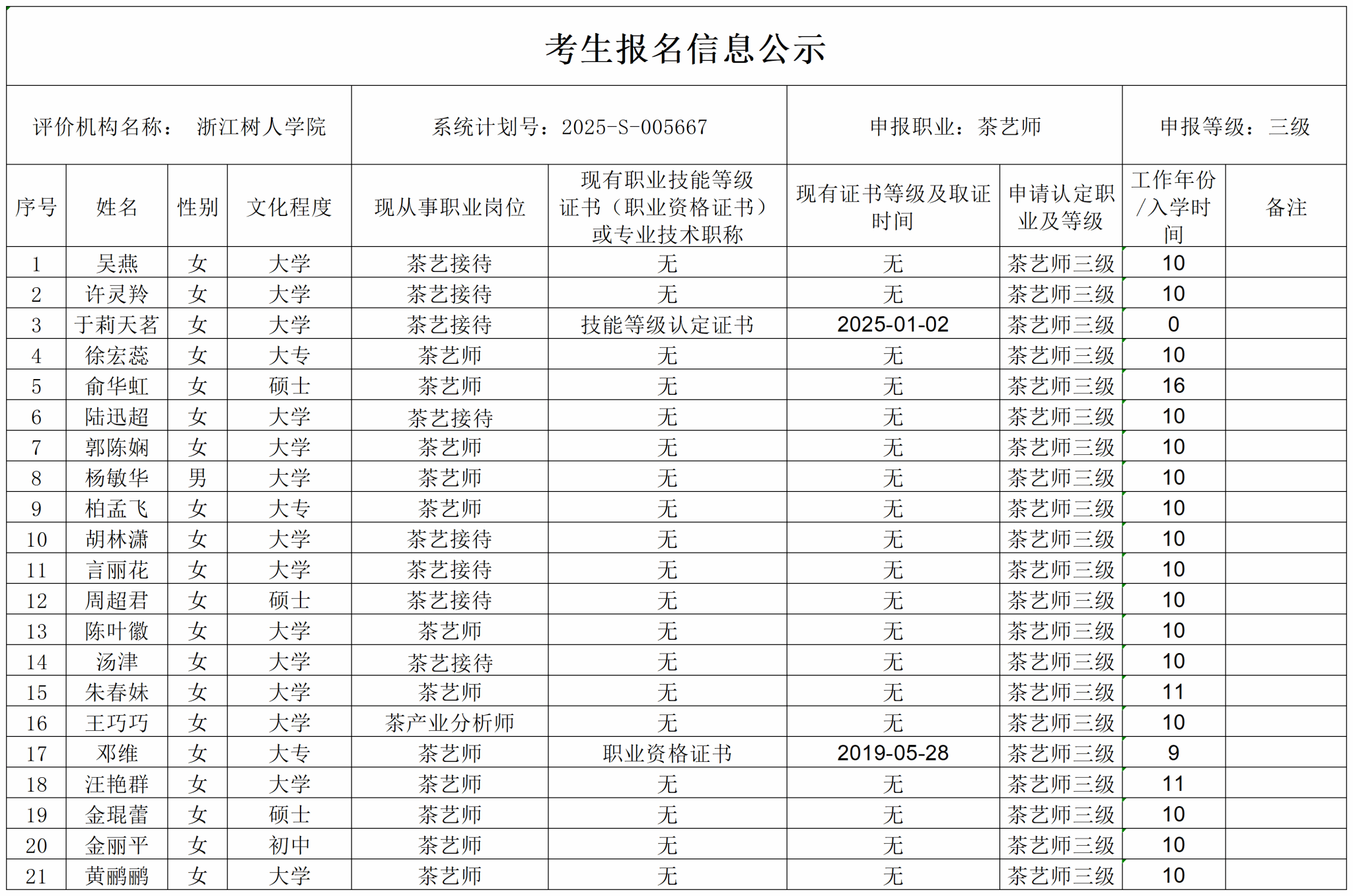 现将通过2025-S-005667批次茶艺师高级(三级)职业技能等级认定资格审核考生信息予以公示,公示期2025年8月1日至8月7日,如对公示情况有异议,请提供有效证据,并实名电话或书面联系公司职业技能等级认定中心。
