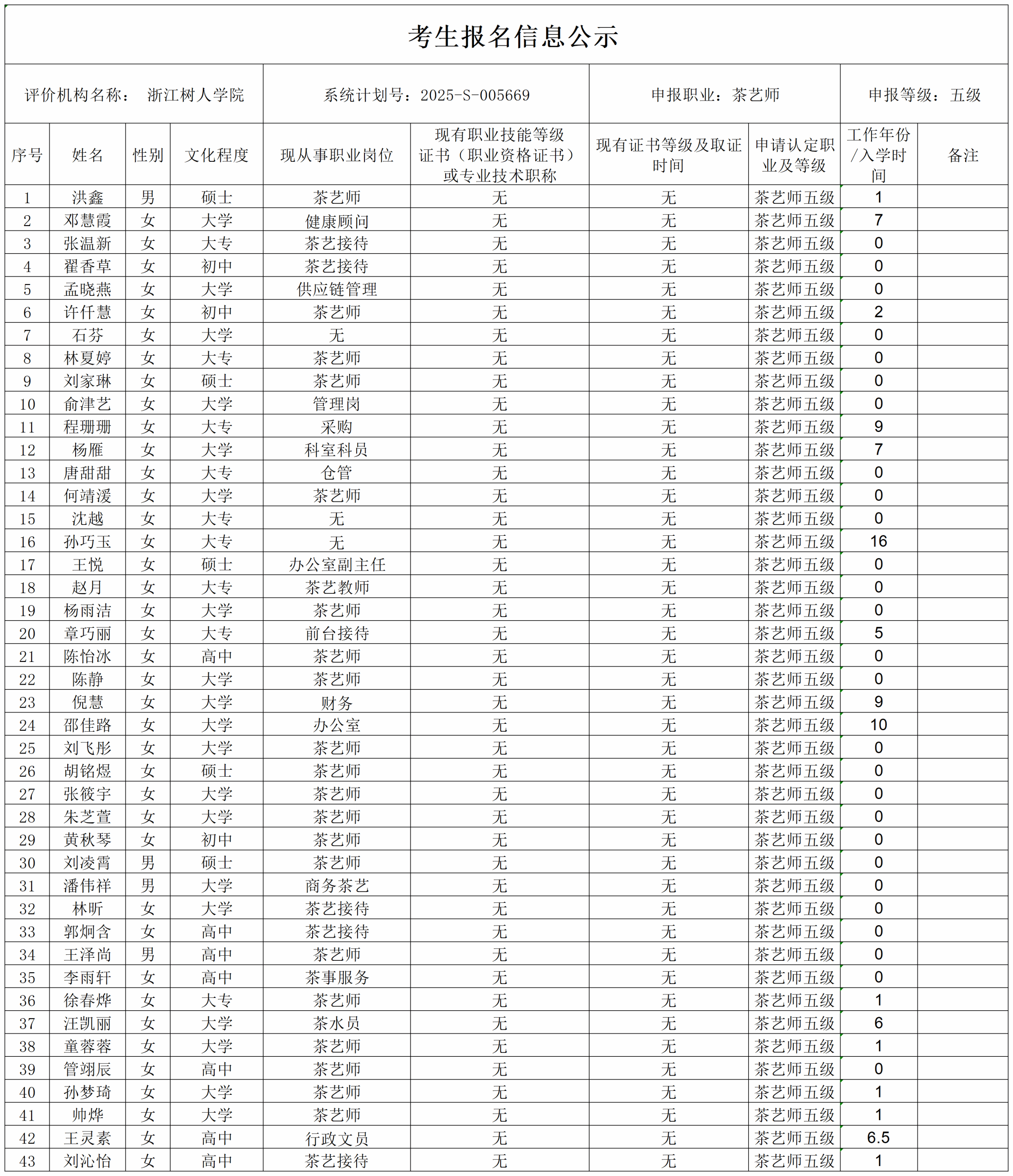 现将通过2025-S-005669批次茶艺师初级(五级)职业技能等级认定资格审核考生信息予以公示,公示期2025年8月1日至8月7日,如对公示情况有异议,请提供有效证据,并实名电话或书面联系公司职业技能等级认定中心。