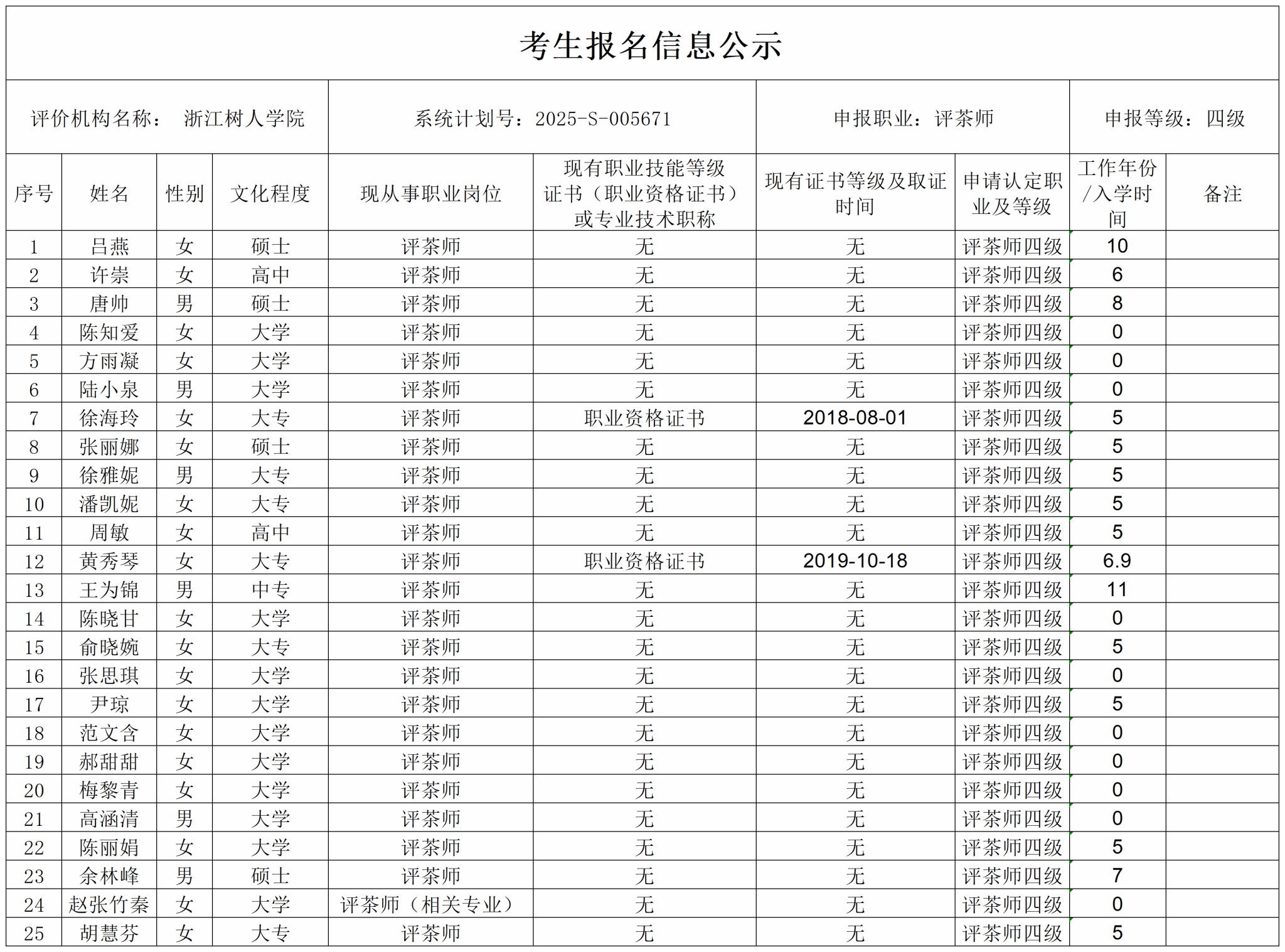 现将通过2025-S-005671批次评茶师中级(四级)职业技能等级认定资格审核考生信息予以公示,公示期2025年8月1日至8月7日,如对公示情况有异议,请提供有效证据,并实名电话或书面联系公司职业技能等级认定中心。