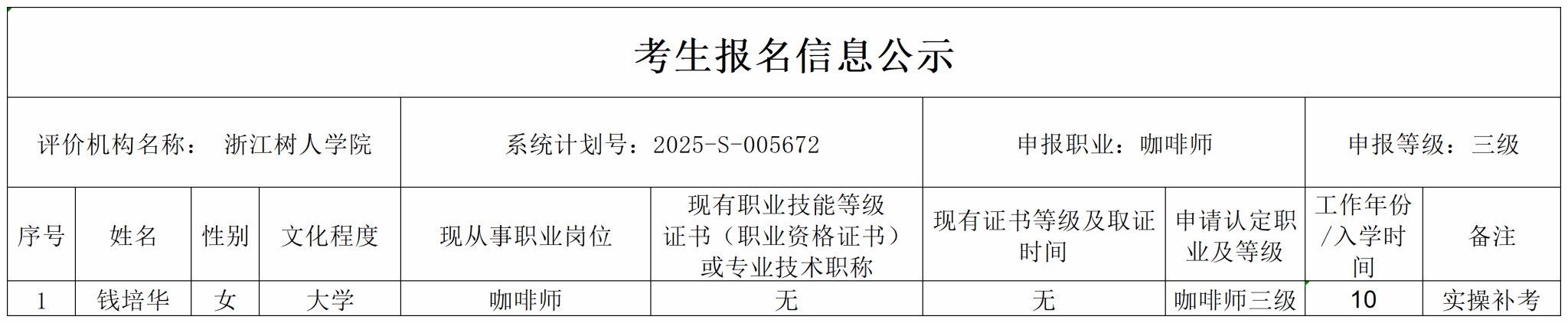 现将通过2025-S-005672批次咖啡师高级(三级)职业技能等级认定资格审核考生信息予以公示,公示期2025年8月1日至8月7日,如对公示情况有异议,请提供有效证据,并实名电话或书面联系公司职业技能等级认定中心。